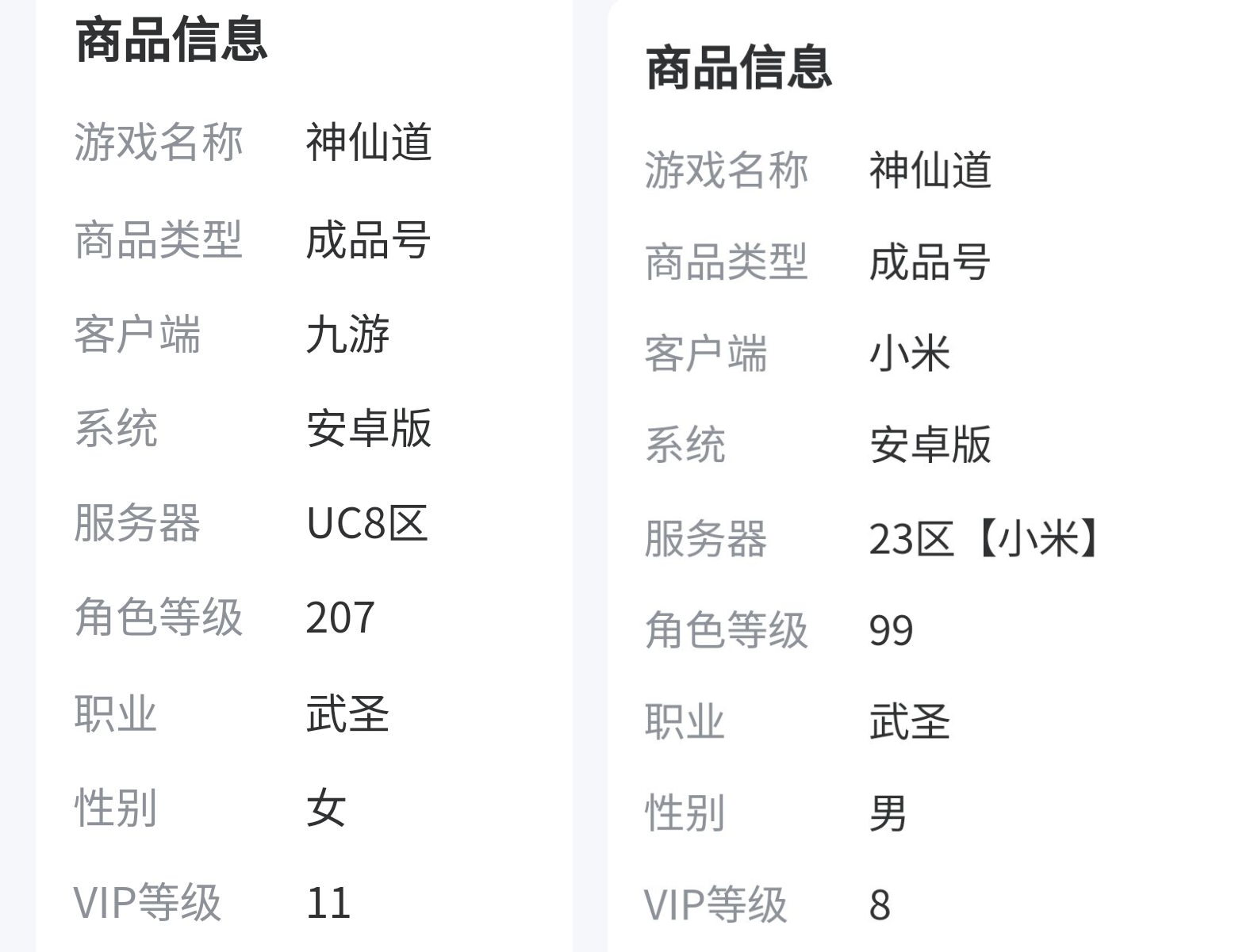 买家在选择账号的时候肯定是要对同等价位的商品做出自己的性价比判断,虽然平台对每个账号都有着相应的性价比评分,但更多的是要靠自己观看。幸好交易猫在商家填写信息的时候就给了一套神仙道的模板表格,主要是根据客户端系统、职业、性别、VIP等级等信息来进行填写,这样买家就可以很好的利用筛选和分类来进行综合比较。