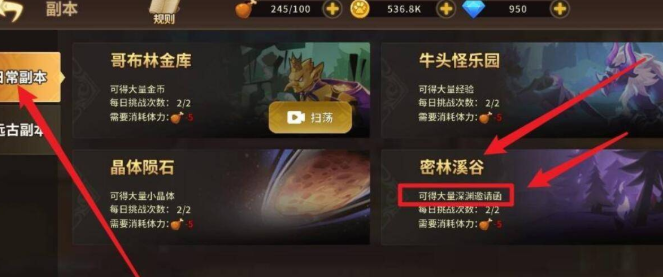 进入到日常副本之后的话,玩家能够看到一个交错密林溪谷的特殊副本,点击进入挑战,进入到该地图之后,只要玩家击败敌人,敌人就会有概率直接掉落深渊票,密林溪谷副本的挑战难度并不高,这里的怪物的强度并不高,基本上一套就能够全部带走了,在刷深渊的时候,刷装备建议前往深渊5-1,刷金币的话前往5-5进行挑战,不同的地图,掉落的东西也会有所区别,大家在挑战的时候需要注意。