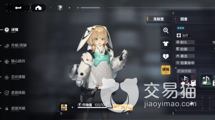3、回音:一个十分卡哇伊的呆萌妹子,由于是一个三星角色,所以属性方面都比较偏弱,比较适合新手在前期开荒使用,大招能够帮助队友回复10%的血量,在前期还是十分不错的。