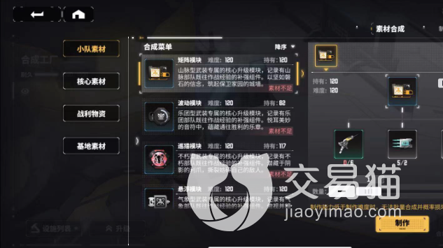 第二种:合成工厂,玩家可以通过合成工厂中的菜单,玩家可以在里面选择需要合成哪一种模块,每一种模块合成需要的材料也是不同的,玩家如果有这些材料就可以指定合成了,优点十分明显,玩家缺什么模块就可以指定合成。
