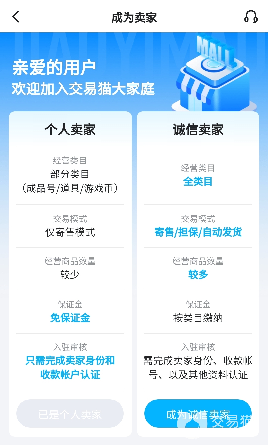 关于如何在交易猫上卖账号,其实流程非常简单。下载好交易猫app登录以后(还没有交易猫的朋友,点击上面的按钮即可获取),自主选择要成为“个人卖家”/“诚信卖家”,之后在主界面找到“我要卖”,搜索选中游戏后,按照提示填写详细商品信息,点击发布即可,商品会在平台审核通过后上架。