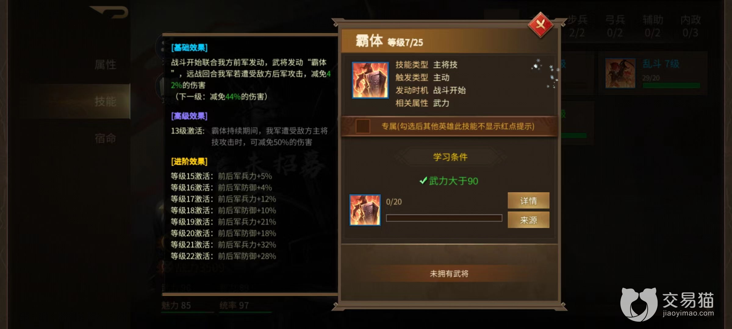 在其他技能选择上,除了主将技霸体之外,还可以搭配鼓舞、乾坤、无双、乱斗盾墙等。重点应该放到强化主将技和步兵技能上面,因为董卓主要依靠前军来抵挡伤害,反而输出并非是最主要的目的。阵容搭配方面最佳队友当然是貂蝉,共同出战时董卓可以使用合击技虎兕美人,直接对敌方造成一次高额伤害,还有几率使其陷入到虚弱状态。还可以选择华雄、贾诩、张辽等。