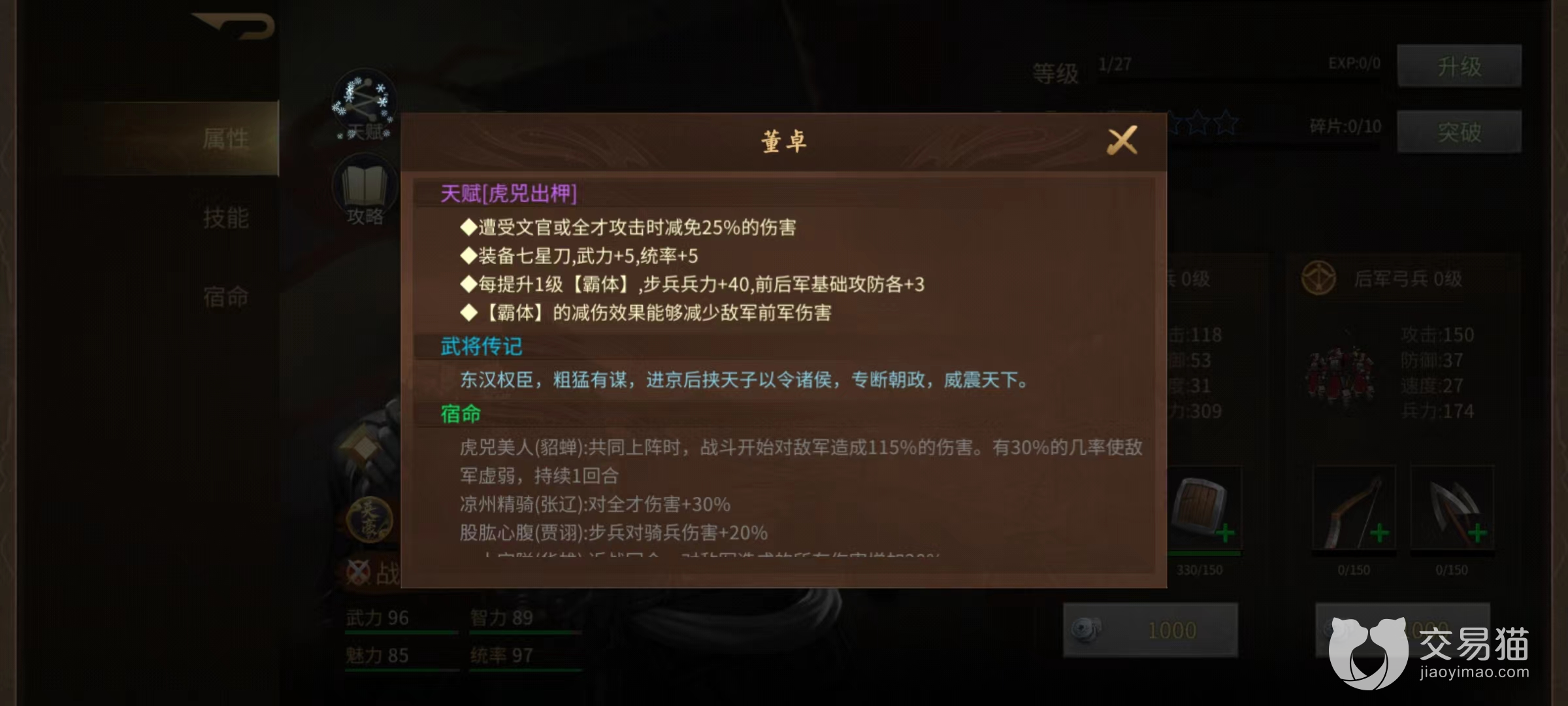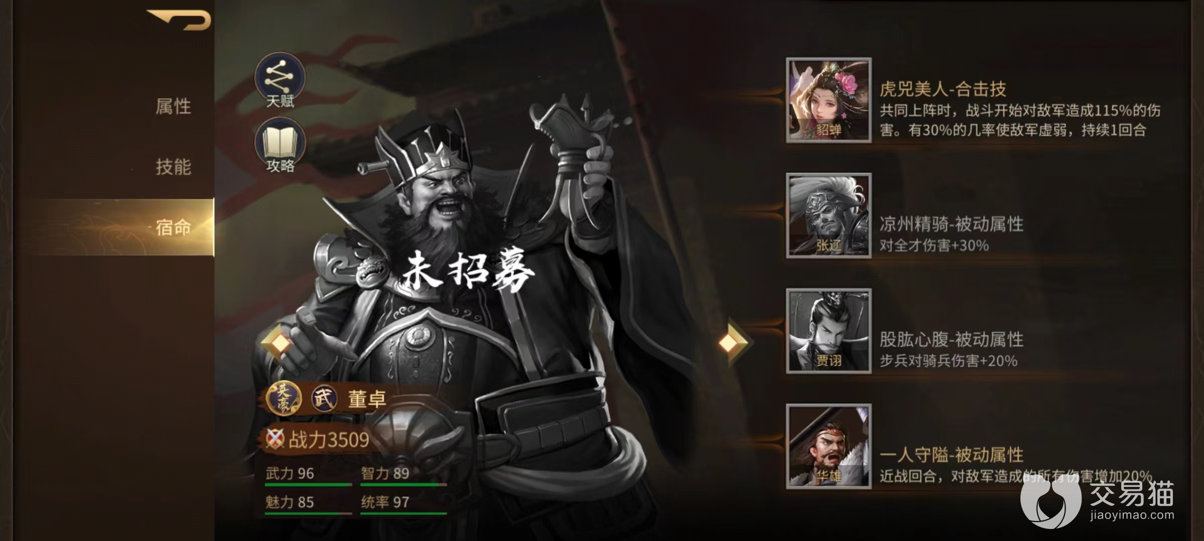在三国历史中董卓绝对是非常重要的一名角色,在很多历史节点都扮演着重要的作用,而在朕的江山2中,董卓同样以强力武将的身份登场,今天小编来讲一下朕的江山2董卓好用吗。董卓在游戏中属于目前属性最强的英豪型角色中的一员,这使得在各项属性方面拥有很好的成长,而具体使用需要看自身的天赋。