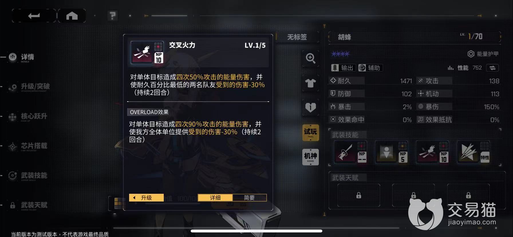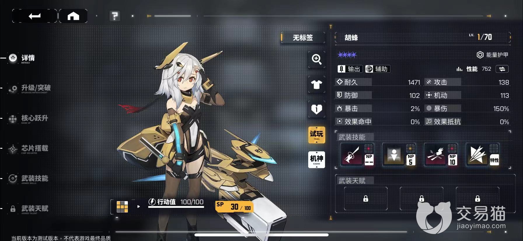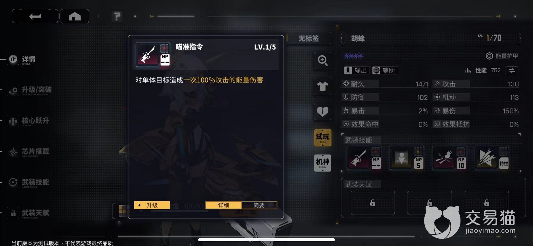 这个角色一共会有四个武装技能,其中前三个属于她的主动技能,玩家可以主动释放,最后一个是他的被动技能。另外,胡蜂还有一个机神形态,这个机神可以让其战斗效果得到翻倍提升,而且化身为机神之后,防御率也将得到成倍的增长,看完基础属性之后,再来看看她的三个攻击技能,一技能为瞄准指令,可以指定敌方一个目标,受到一次100%的物理攻击伤害。