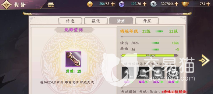 各位玩家小伙伴可以通过强化系统来提升无锋重剑,每一次对该武器的强化升级都可以让它的攻击属性进行大幅度的提升,玩家们可以利用该属性机制可以进行搭配合适的前排武将,这样才能将该武器的潜能发挥到最大。在对该武器进行培养的时候玩家需要使用大量的金币,所有玩家平时需要多注意积攒金币数量,以保证可以成功的强化所有的武器。