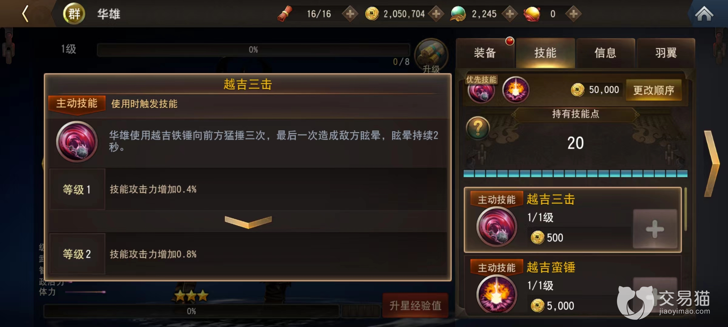 华雄虽然在初期是三星武将,但是因为抽到的碎片比较多,所以升星比较简单,在前期快速成长起来也是非常有好处的,再加上武将本身体力和武力值都非常优秀,也能有不错的输出。第1个主动技能越吉三锤,使用铁锤向前方猛锤,在最后一次锤击结束后对伤害目标造成眩晕。第2个技能越吉蛮锤,双手举锤向地面猛击,使用之后降低受到的物理伤害,可以持续10秒钟。在提升技能等级后不仅攻击属性提高,受到的物理伤害也将减少。