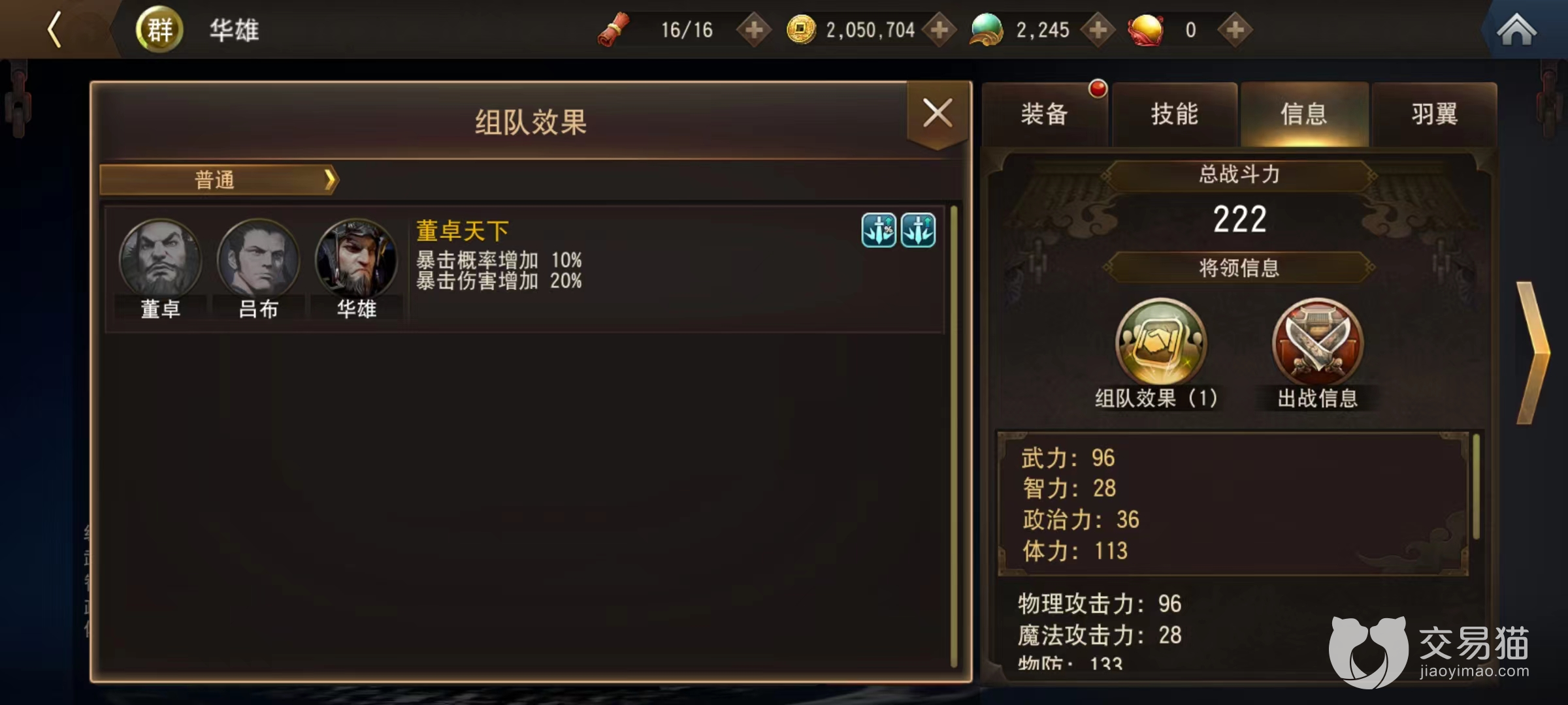 但是华雄在组队搭配上比较单一,这是一个限制比较大的地方,目前主流就是和董卓、吕布一起形成董卓天下的羁绊效果,可以提高暴击率和暴击伤害。重点为了突出吕布,所以选择华雄的玩家一般都会提升吕布。然后以华雄作为辅助,毕竟提高了暴击之后对吕布的加成是非常大的,前期可以用来推图,后期就逐渐沦为了工具人,不过在关键的时候依然能够发挥作用。