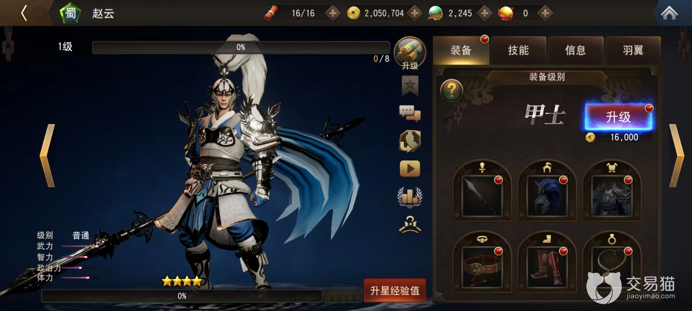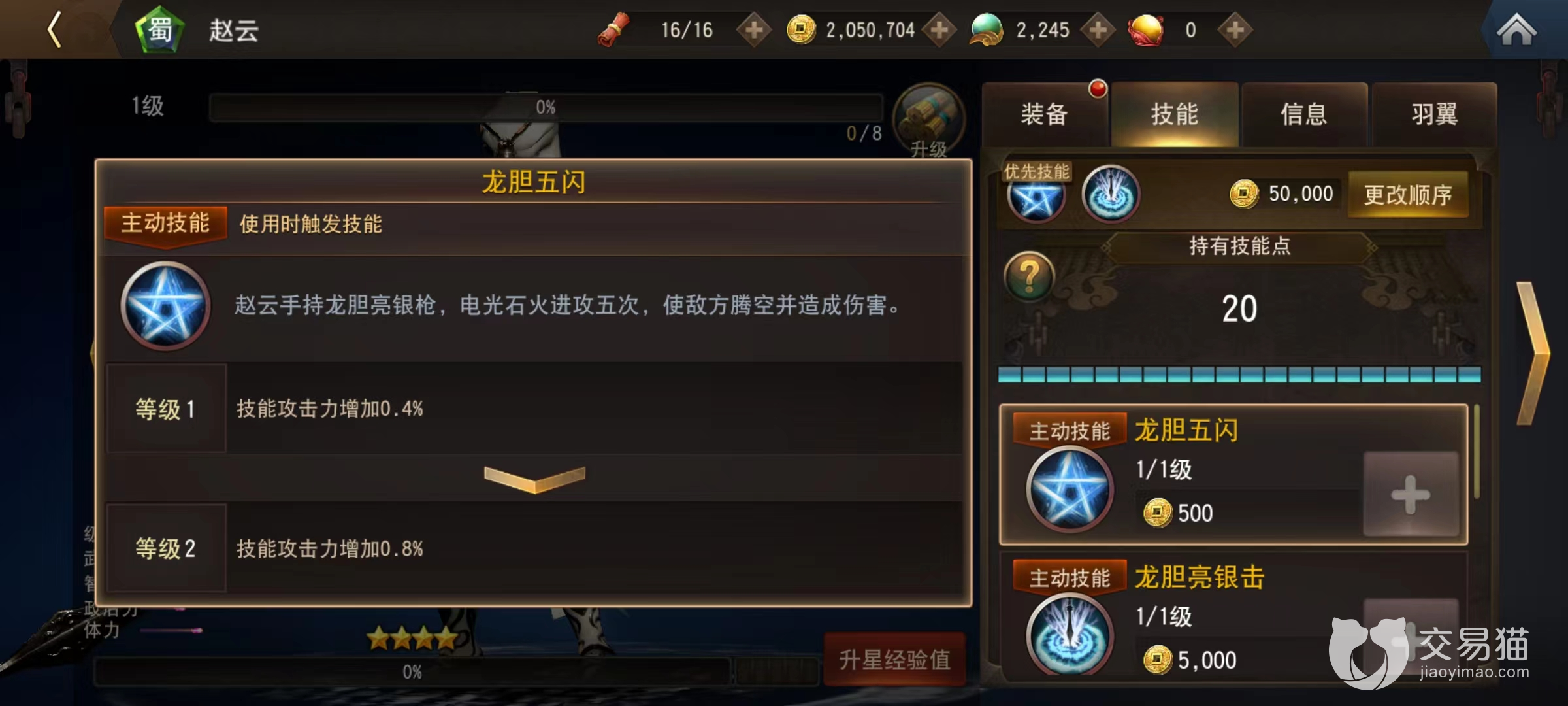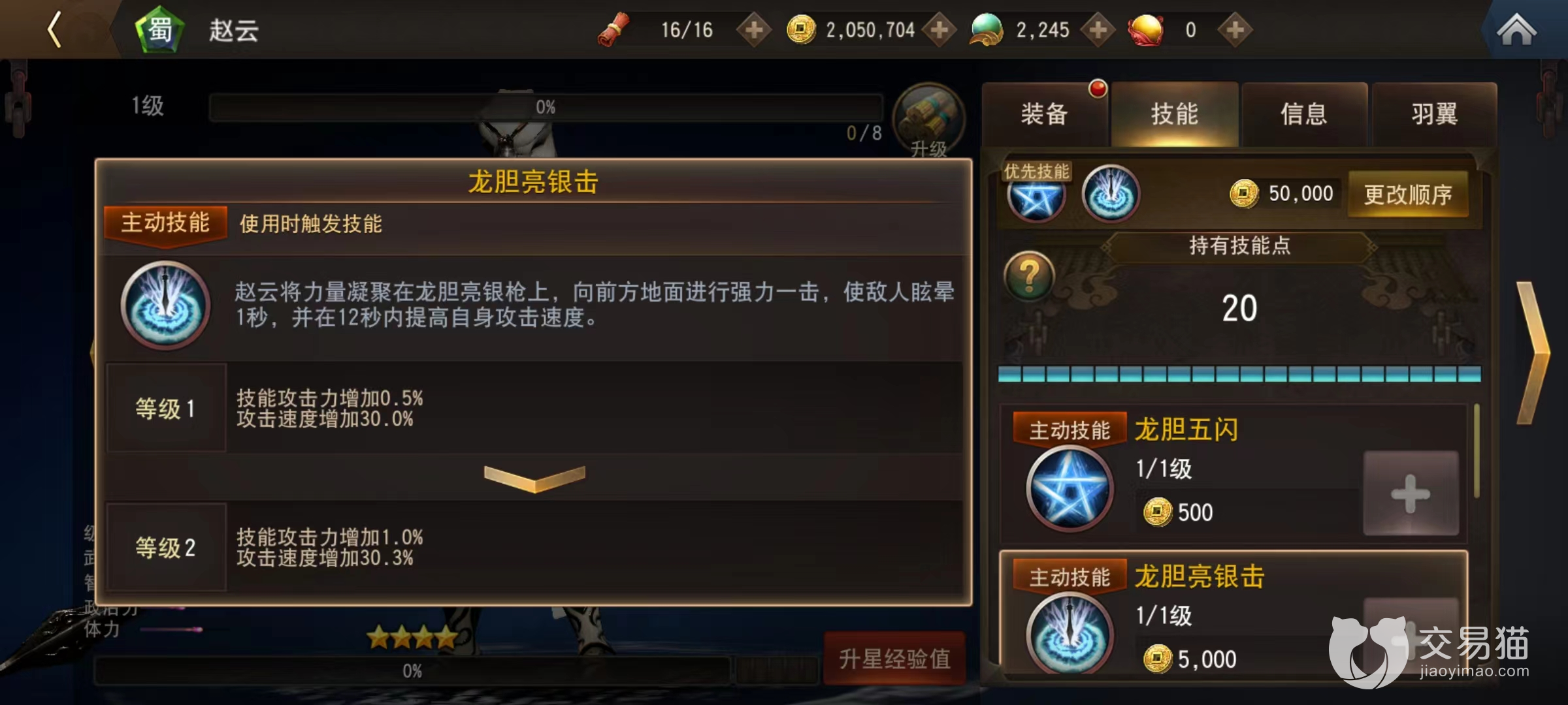 赵云属于4星武将,初始物理攻击132点,物防和魔防也相当优秀,各个方面比较全面。还有有单挑特技连续攻击,这在单挑的时候也能占据一定的优势。主动技能龙胆五闪,手持亮银枪以极快的速度向前方攻击5次,并且使敌人腾空受到伤害。第2个技能龙胆亮银击,将全部力量凝聚在长枪上,向前方地面造成强力一击,除了使敌人受伤眩晕之外,在接下来的12秒钟之内赵云的攻击速度也将获得提升。