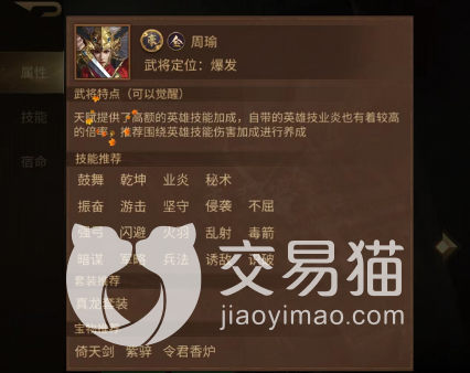 既然这个角色是值得培养那么大家要如何培养呢?首先升级是不用多说的,它的定位伤害就是爆发,所以大家可以选择的后期技能有鼓舞、乾坤、业炎以及不屈之类的,暗谋是比较适合这类智慧不错的武将的,业炎以及毒箭这两个技能是可以搭配使用的,所以小编建议大家要是选了业炎这个技能也可以在周瑜身上再搭一个毒箭。
