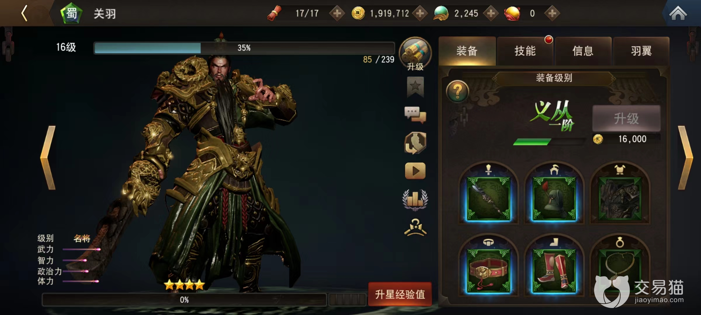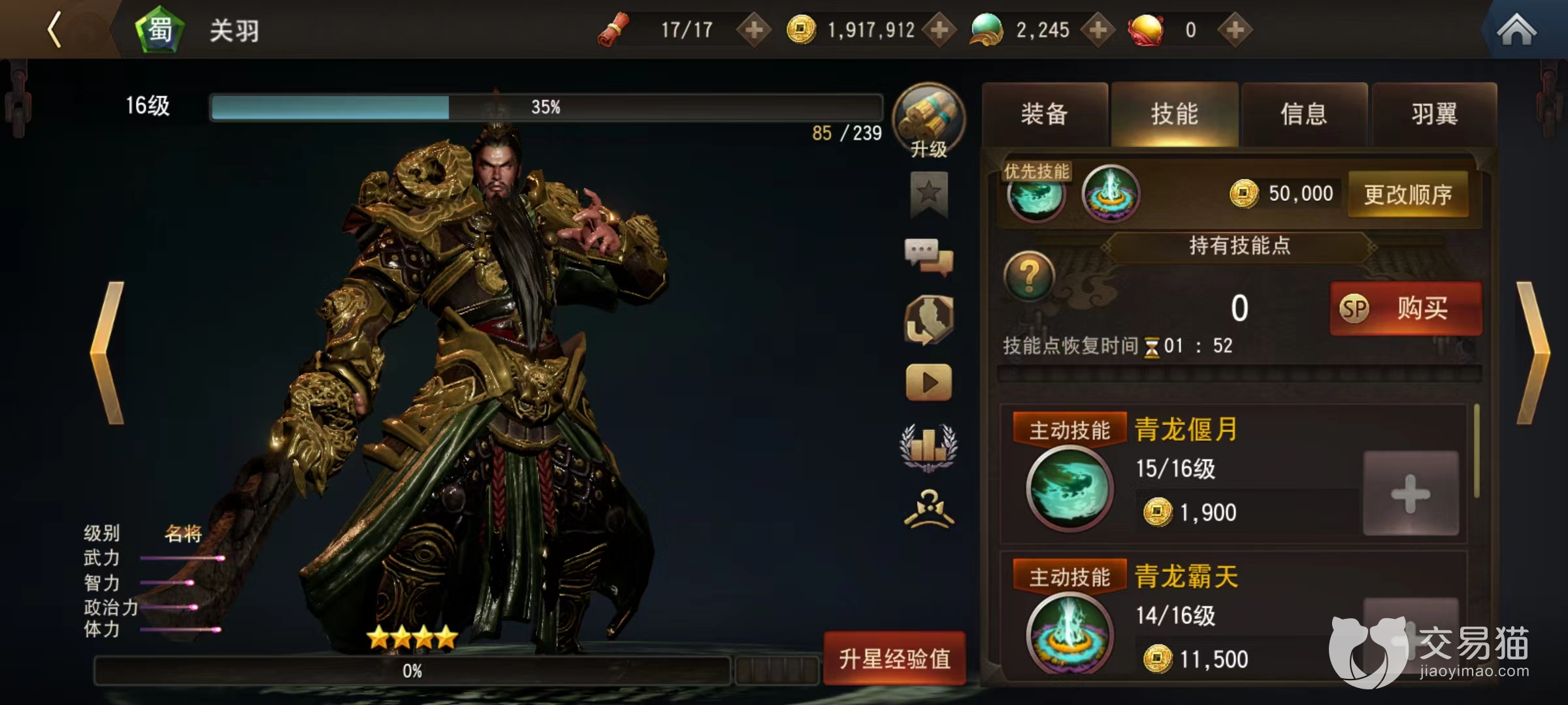 选中一个需要养成的武将后,首先要进行的是升级,因为等级才是最关键的一方面,升级需要用到兵书,兵书也按照品质进行划分,品质越高所提升经验也就越高。但目前武将等级存在上限,无法超过主公等级,所以此项培养虽然重要但是消耗的资源并不多,所有武将都能跟上。接下来是技能升级,每一个武将都有两个主动技能,一个替战技能和4个被动技能,因为前期装备的缘故所以被动技能只有两个,需要优先升级的是主力武将的主动技能。