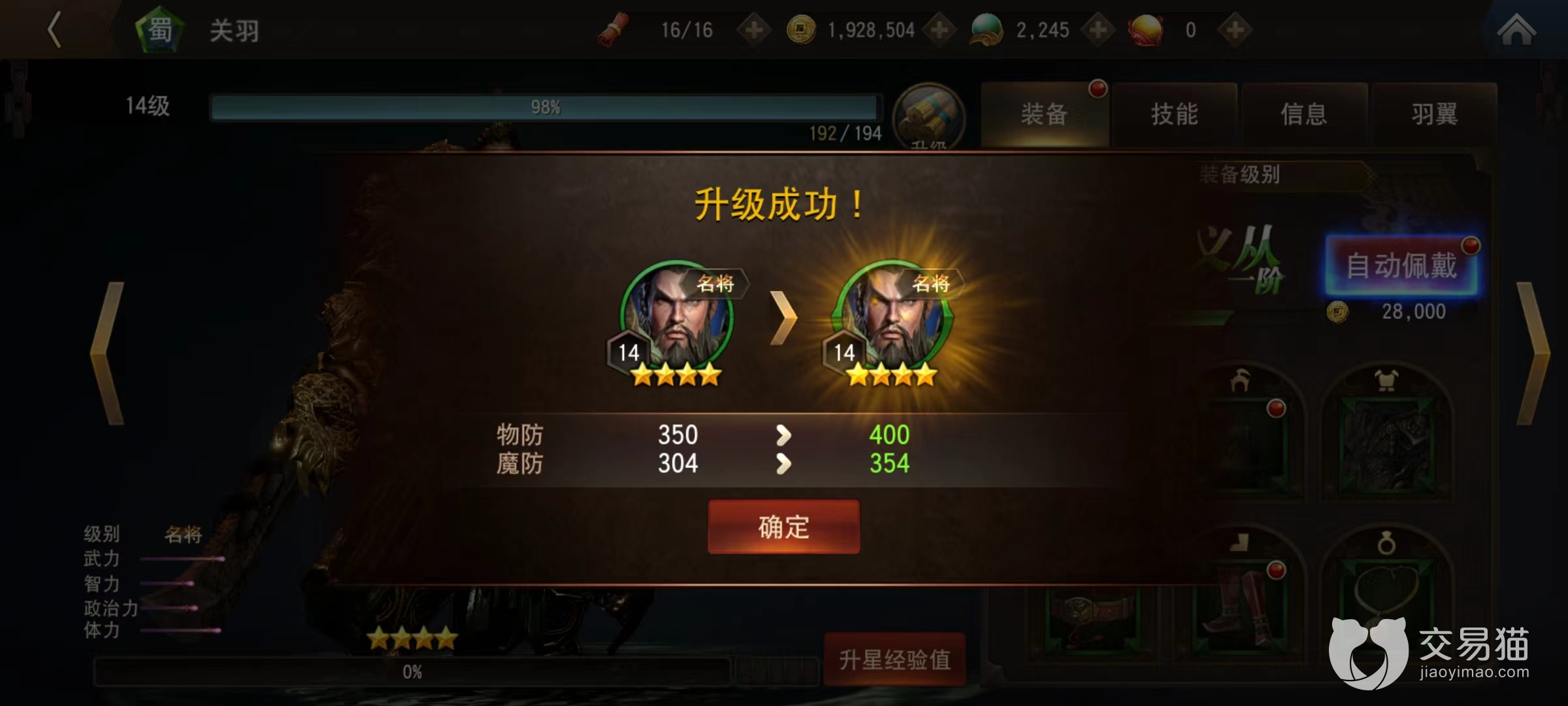 最后是装备,每一个武将都可以穿戴6件装备,无需大家去收集获得武将之后自动穿戴好装备,但是需要利用各种道具进行强化。强化需要对应的材料和铜币材料在副本中获得,如果道具充足,可以使用一键升级功能。