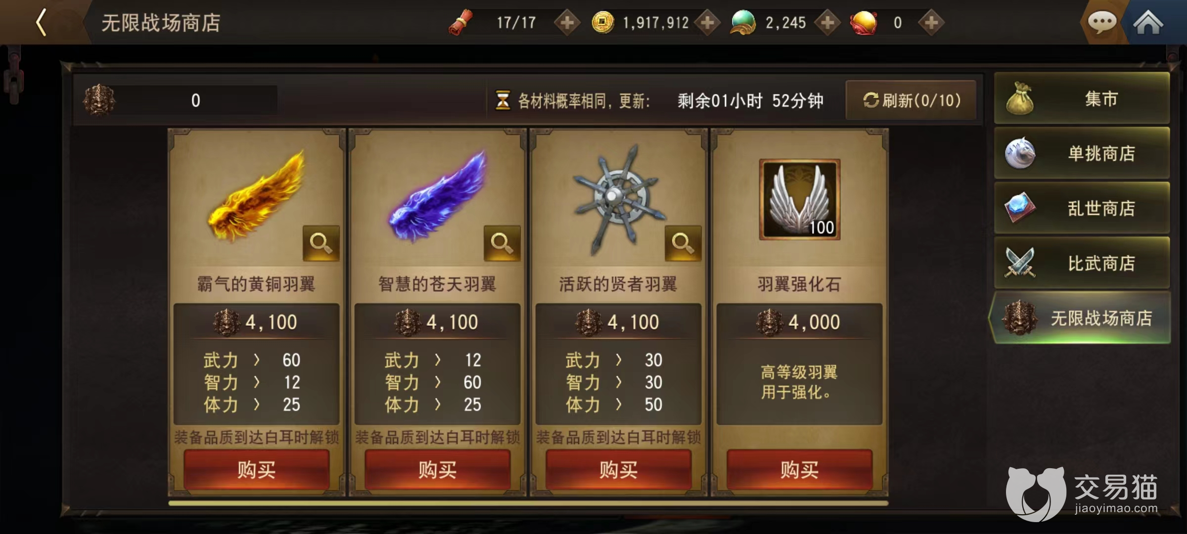 再往后是羽翼,可以提升武将主要能力值,但是只有当装备达到白耳级别以上的将领才能佩戴,所需要的道具可以去无限战场中通过铸币来购买。而后利用羽翼强化石进行强化,还存在有一定的几率,所以也是非常消耗资源的一项,不过对战力的提升却很关键,属于后期才进行的内容。