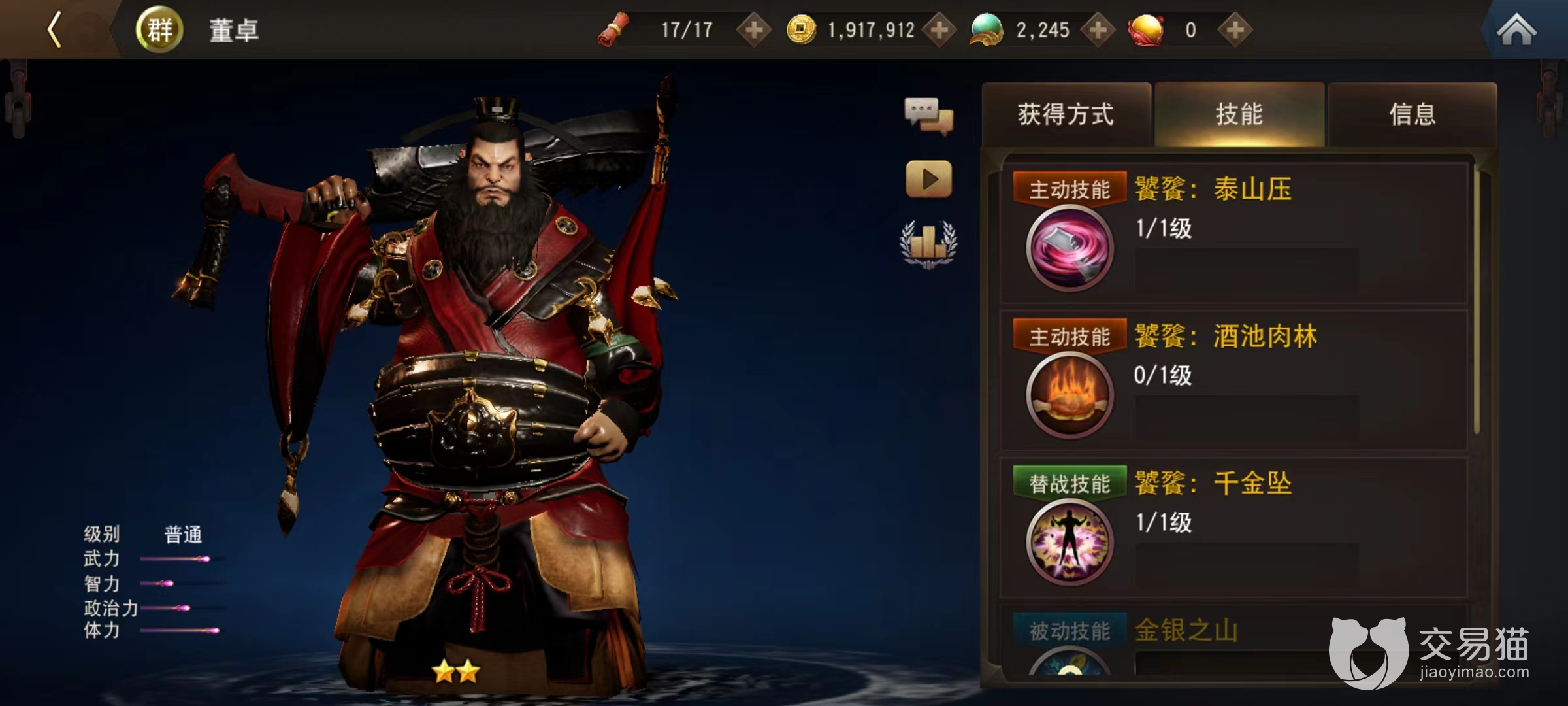 董卓和上面三人不同,不属于输出类型而且初始星级不高,但这并不影响他登顶排行榜。主动技能泰山压,旋转大刀打击敌人,并且能够凌空跳起撞击敌方。主动技能酒池肉林,快速吃下肉并且能大幅度恢复体力,接下来物理伤害提高。这是董卓赖以生存的技能,在战场中直接就能恢复体力,所以在扛怪方面非常擅长。而且在被动加成下,受到物理伤害降低,还可以额外获得金币。