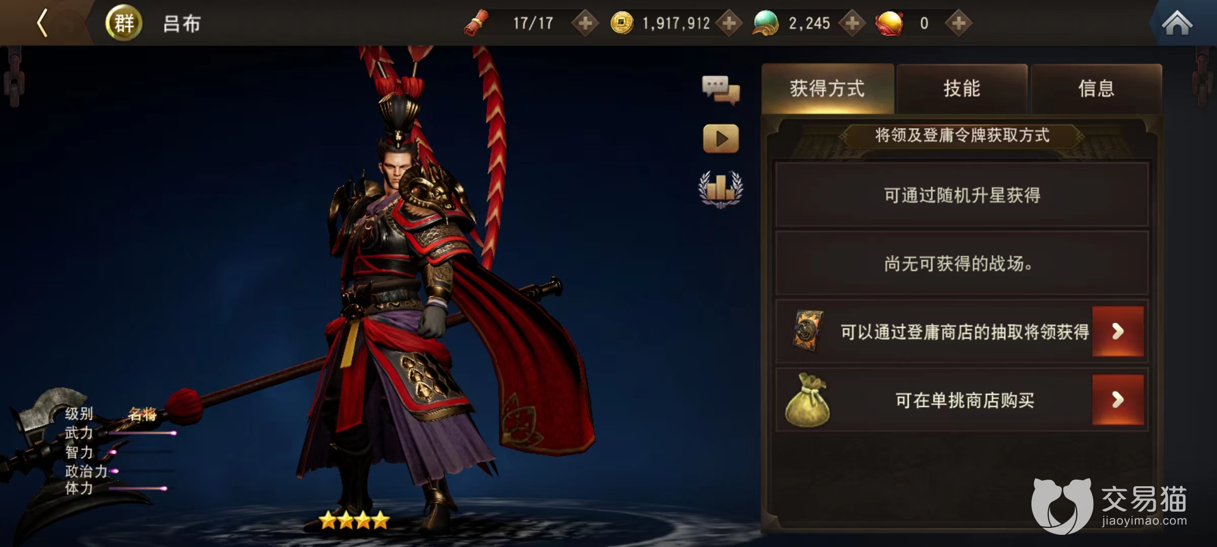 吕布是目前输出最高的武将,主动技能武神咆哮,将敌方拽到身侧并且有额外的物理伤害加成,使得目标在接下来受到的伤害提高。主动技能画戟破天,使用方天画戟进行一次强力攻击,在接下来的短暂时间内免疫失常状态影响。吕布自身就能完成聚怪清理等一系列操作,所以完全可以直接冲锋对大量敌人造成收割。而且吕布的被动技能还可以提高暴击率,在暴击时恢复体力,单打独斗也完全不虚。