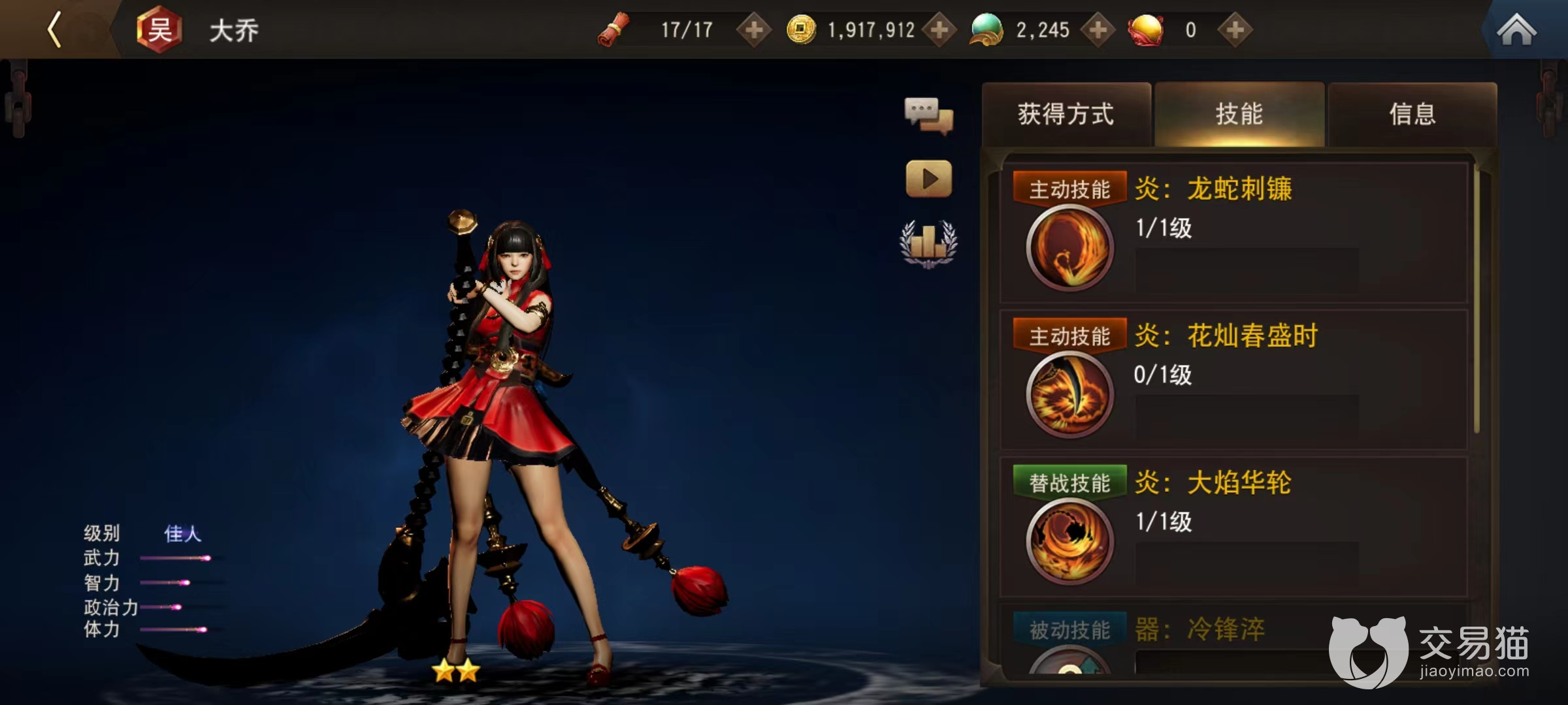 大乔和貂蝉同属于佳人类型,主动技能龙蛇刺镰,使用镰刀攻击前方敌人,将其击飞之后拉向自己。第2个技能花灿春盛时,使用镰刀打击前方敌人,使其腾空并且造成眩晕。大乔技能使用手感非常棒,而且有聚集效果,再加上附加控制,完全能够成为主力输出。在被动的影响下还可以提高攻击速度和技能伤害,非常全能的伤害型角色。