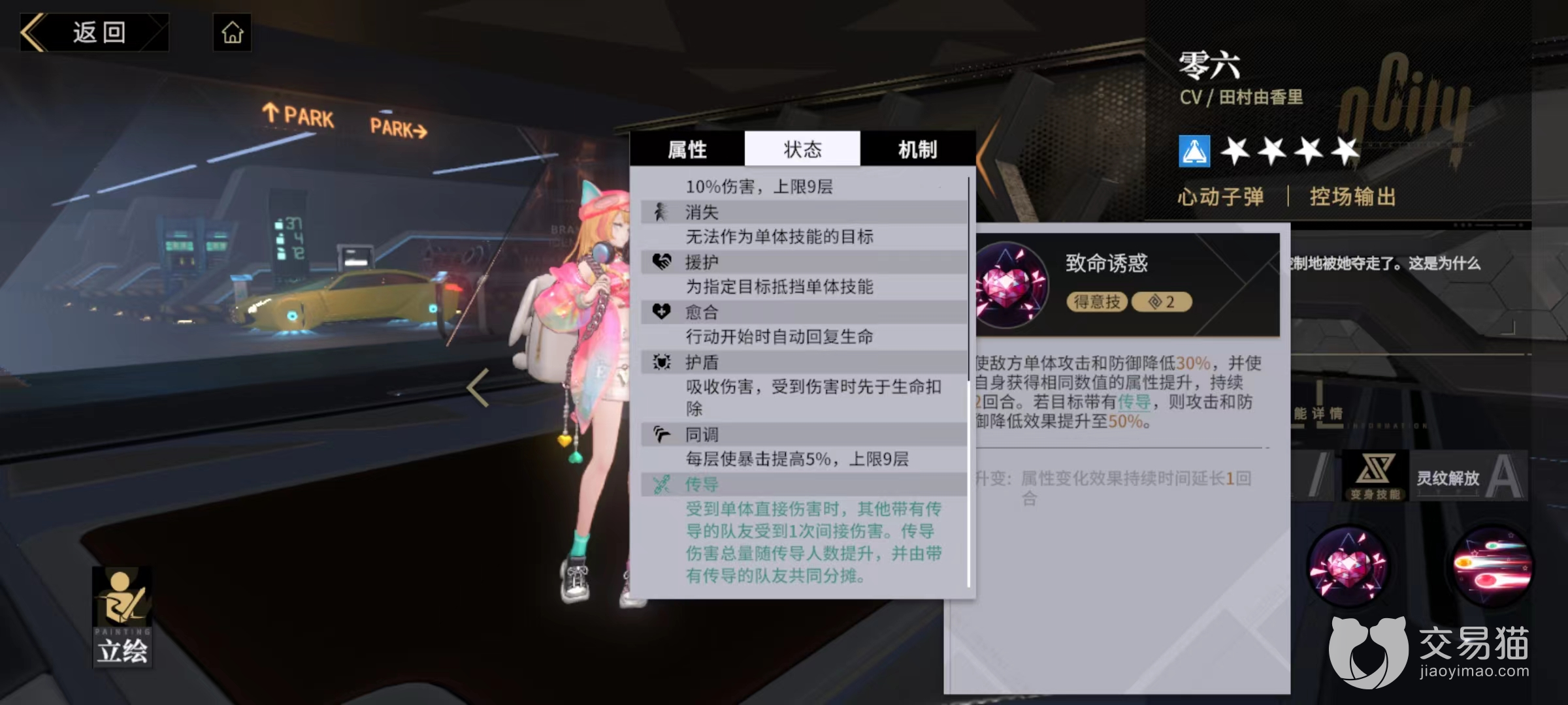 得意记致命诱惑,使用后降低对方单体目标的攻击和防御属性,同时自身获得相同的属性提升,也就是对方降低百分之多少自己就能提升多少。降低和提升效果持续两个回合,如果目标身上带有传导效果,那么属性降低效果将会提高百分比。这就使得零六虽然不属于传导队固定成员,但是依然可以替补身份添加进去。也能够很好的融入。