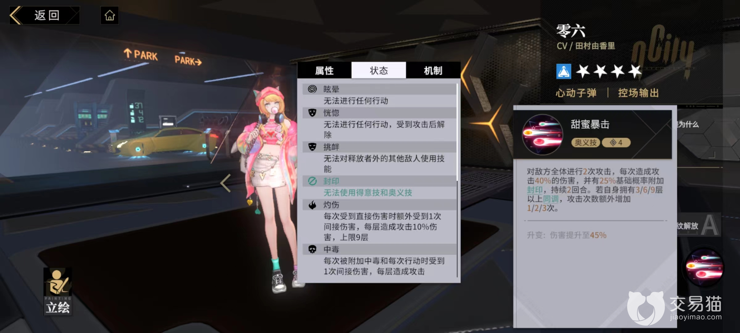 奥义技能甜蜜暴击,攻击对方全体目标,每次攻击使都有几率为其附加封印效果,被封印后持续两个回合,目标无法使用得意技和奥义技,只能普攻。如果在使出大招时自身拥有3层、6层、9层同调效果,则攻击次数可以额外增加,最高增加到三次。攻击次数增加之后,除了伤害提升之外,封印对方几率也同样提高,这也是零六控场输出最大来源。