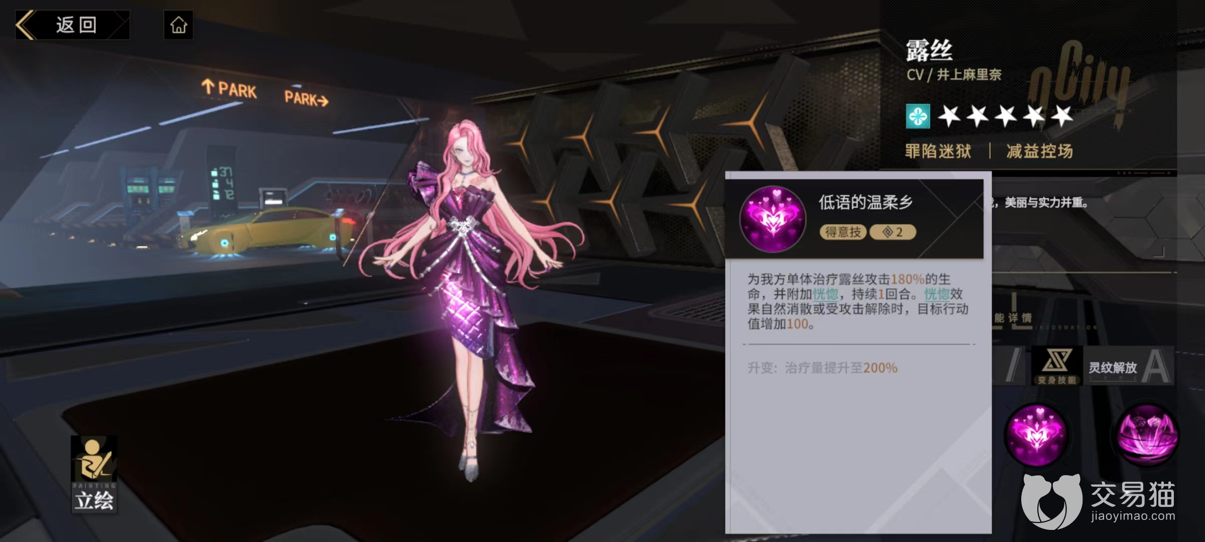 普攻技能席卷的欲望,伤害敌方单体目标,并且必定使其随机获得咩或哞状态的一种,这两种状态是露丝专属的技能,效果是和后面的奥义技相关的状态,在普攻时,如果对方已经具有了这两种状态之一,那么得优先获得另一种。得意技低语的温柔乡,为我方单体目标进行一次治疗,并且为其附加恍惚效果,恍惚影响下无法行动但受到攻击后会解除,当此状态解除时增加目标行动值。