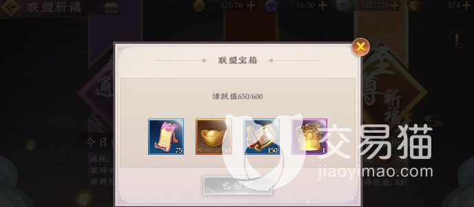 首先,玩家们成功加入联后,进入联盟系统,就能找到联盟祈福,里面的祈福也分了三种档次,分别是普通祈福、高级祈福、至尊祈福。每个祈福消耗都不相同,点击对应的祈福都会有相应的奖励。但祈福也是提高活跃度和提高贡献度的方式之一,如果达到一定的活跃度就可以领去相应的联盟宝箱,联盟宝箱中的奖励如下图所示。个人的贡献度和整体的贡献度高低也关联到了联盟的排名,贡献度越高的人,盟主就越会看中那个人,提拔长老或副盟主都说不定。