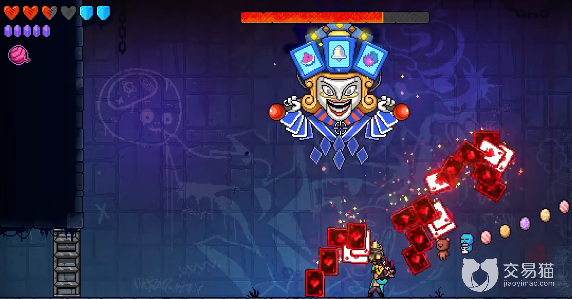 最后到它的第二阶段,玩家就需要注意了,和上面的怪一样也是会召唤巨大的扑克,然后手上还会掉落手雷扑克,就和下雨一样,打法也是照搬上面,留好输出少让它拉出三个七,它拉得越多越对玩家不利。
