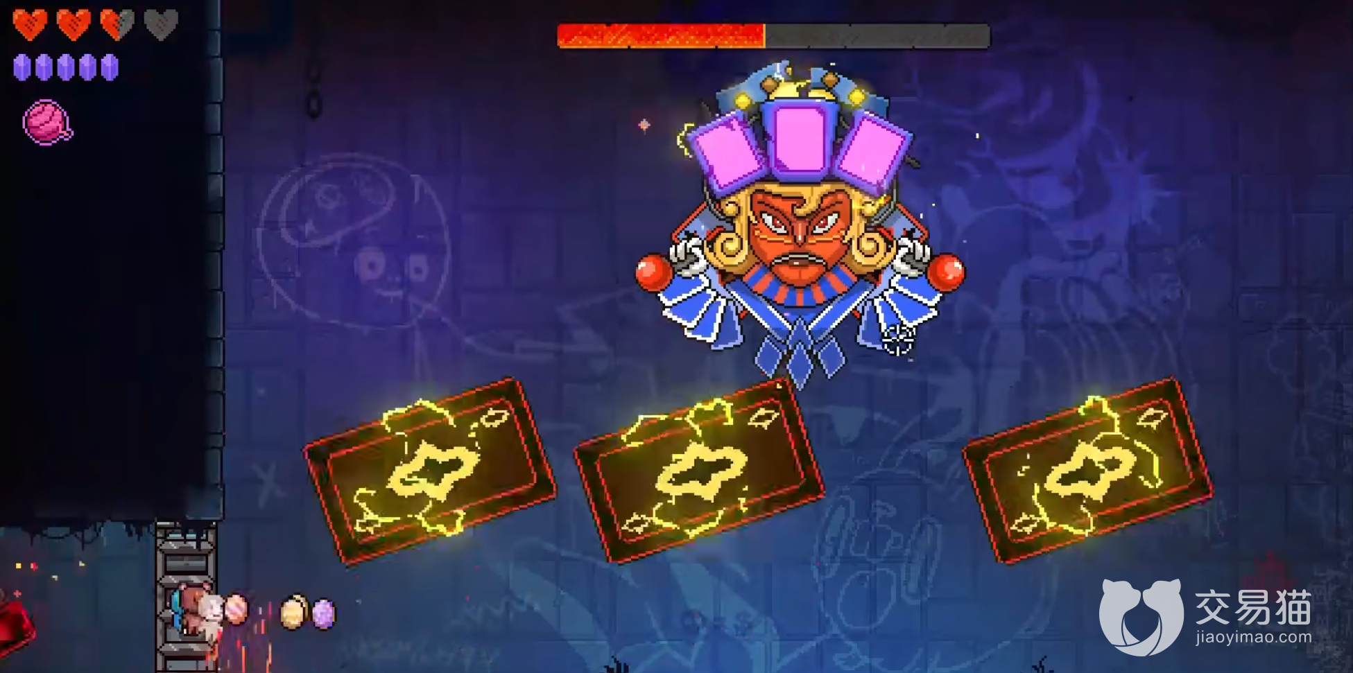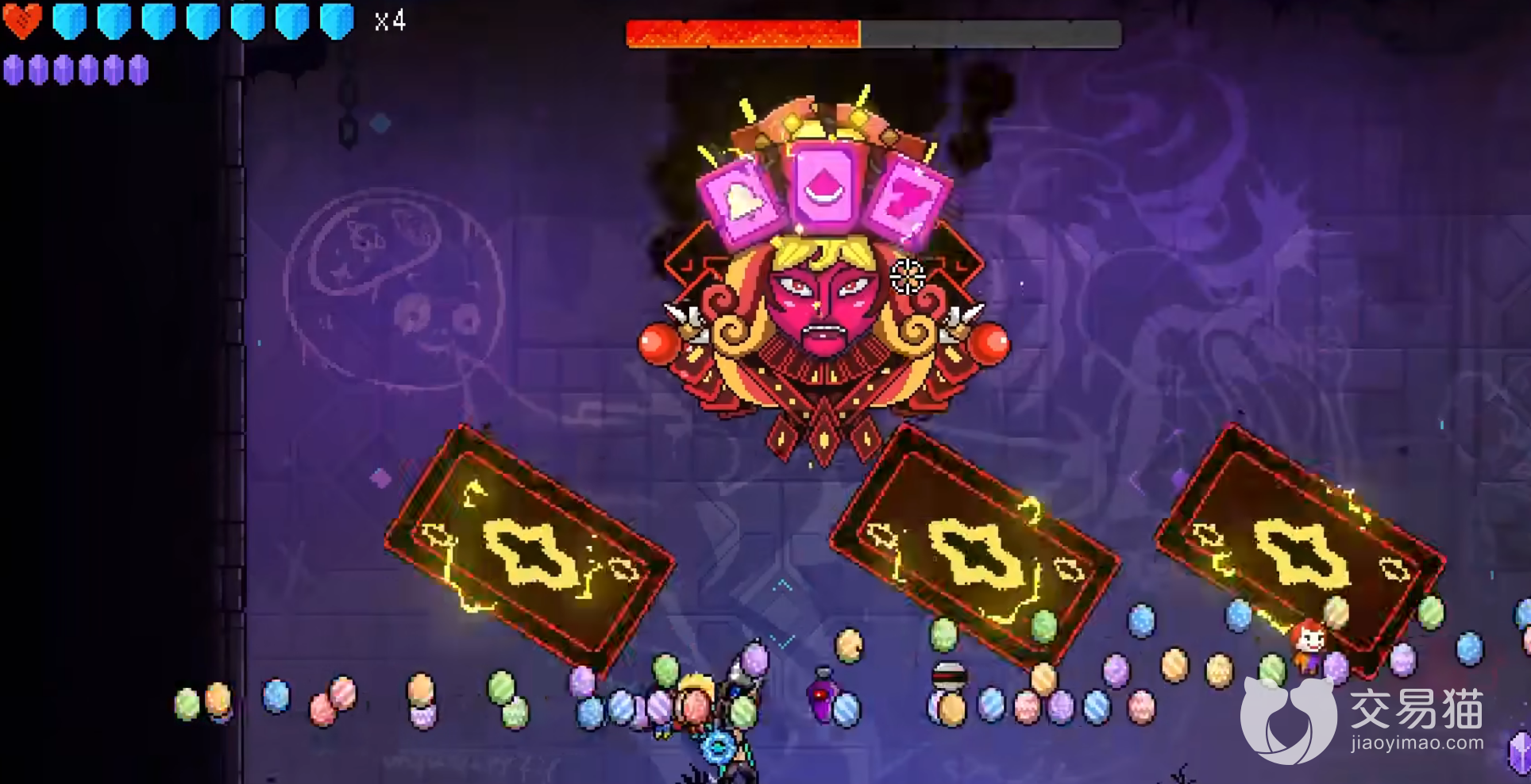 第二阶段相比其他boss没有多大的变化,只是生气到脸都红了,然后这家伙运气暴涨,玩家需要小心它会摇出三个七放出三个巨大的扑克卡主玩家的位置,这扑克放着不管会爆炸,所以不要靠近,这就很限制玩家的走位,所以玩家需要在这里留好输出的技能秒了它。