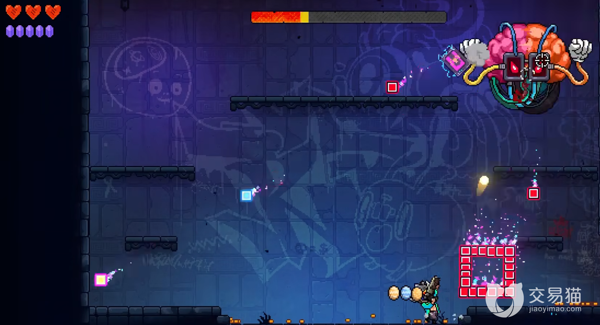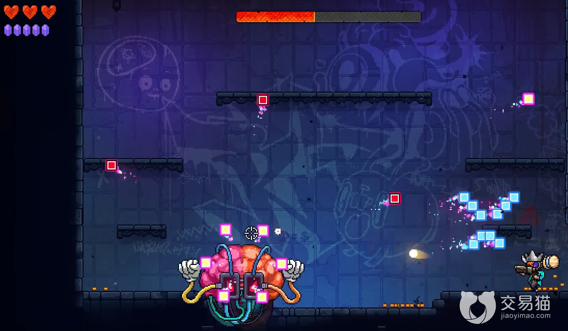 玩家需要跳跃躲闪它的各种样式的方块光线,有蝴蝶类型的有正方形的方块组合以及很烦人的组合攻击,一个不注意就会吃到它的伤害,而且它会做很多动作吸引玩家的注意力,千万不要分神了。