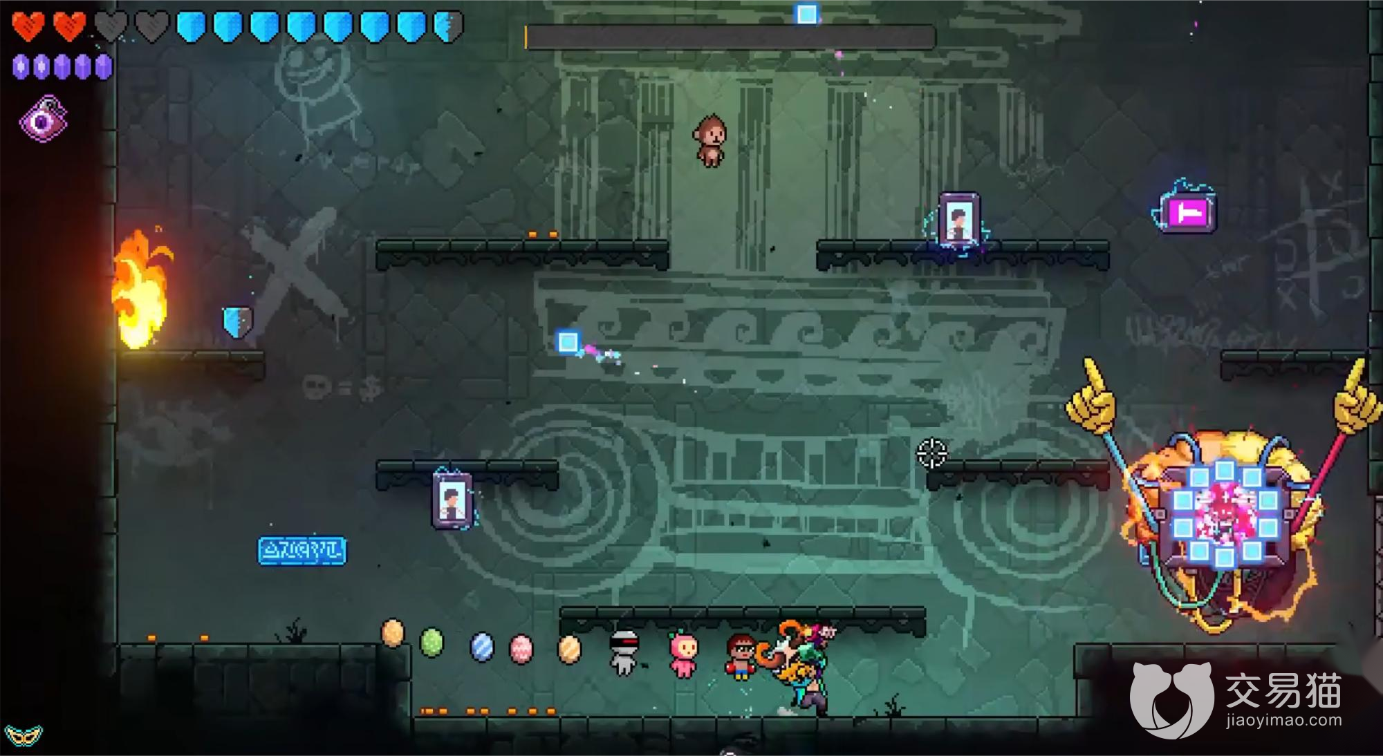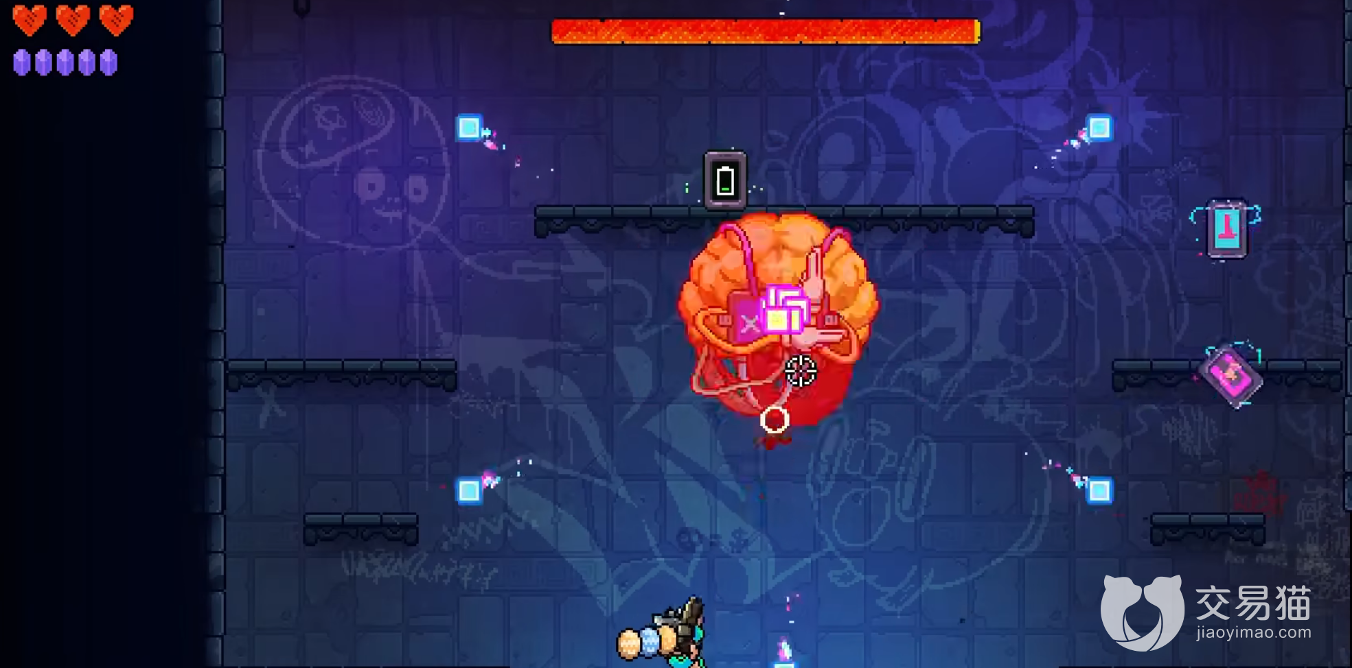 首先遇到这个怪,它是处在房间的中间位置的,玩家需要注意的就是这个怪是不会下地的会一直浮空旋转,然后第一阶段它会扔充电手机类似手榴弹,然后就是类似俄罗斯方块的光线,一旦到中间位置就要小心它的密集弹幕了,它会做一个类似奥特曼大招的姿势然后就是巨多的光线袭来。