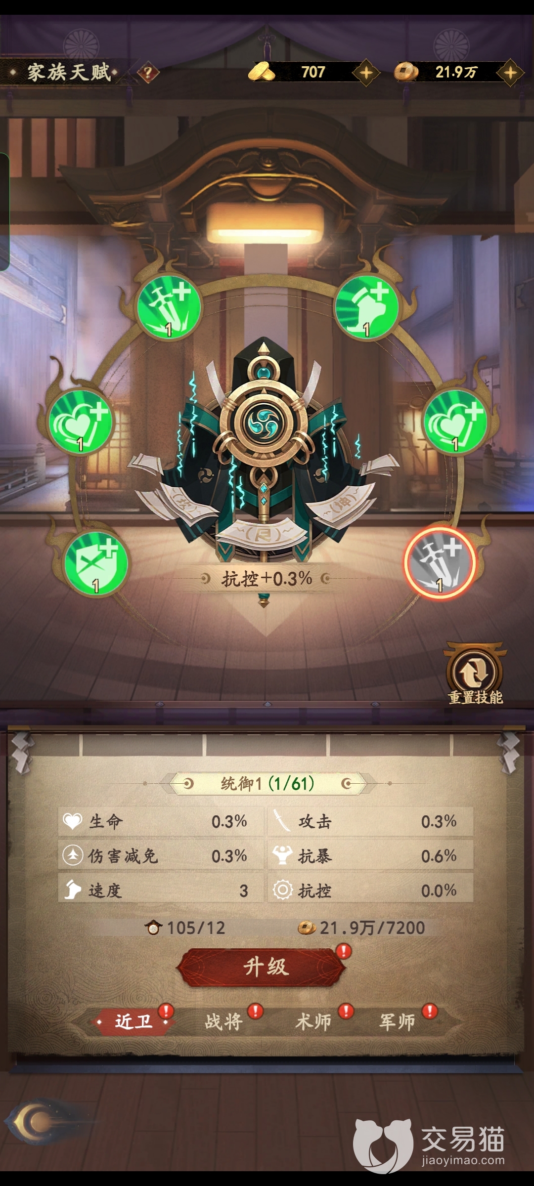 在家族当中每天玩家我可以免费或者花费判金来获取贡献以及经验,贡献可以用来解锁家族技能,总共近卫、战将、术师、军事四个技能,消耗贡献以及铜币可以解锁会给玩家的生命、攻击、伤害减免、抗暴、速度、抗控产生不小的提升,当然仅凭每日贡献是完全不够的通过家族试炼以及家族战争也是可以得到很多的贡献的这就看玩家的家族实力以及每日打卡了。
