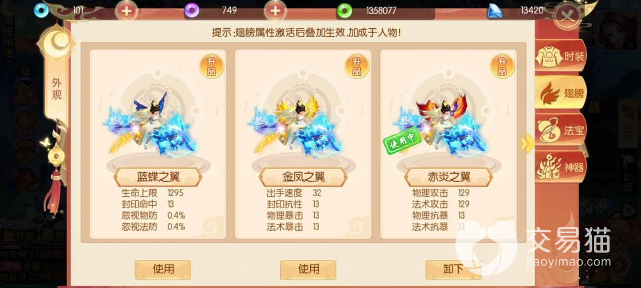 并且在游戏里服饰也会有一定的加成,能够添加的一些属性都是挺不错的。除了服饰之外这里还有翅膀这件外观的设定,它们的获取凡是和服饰的基本一样。但游戏里的那些法宝是需要在副本还有比武大会上才能拿到。