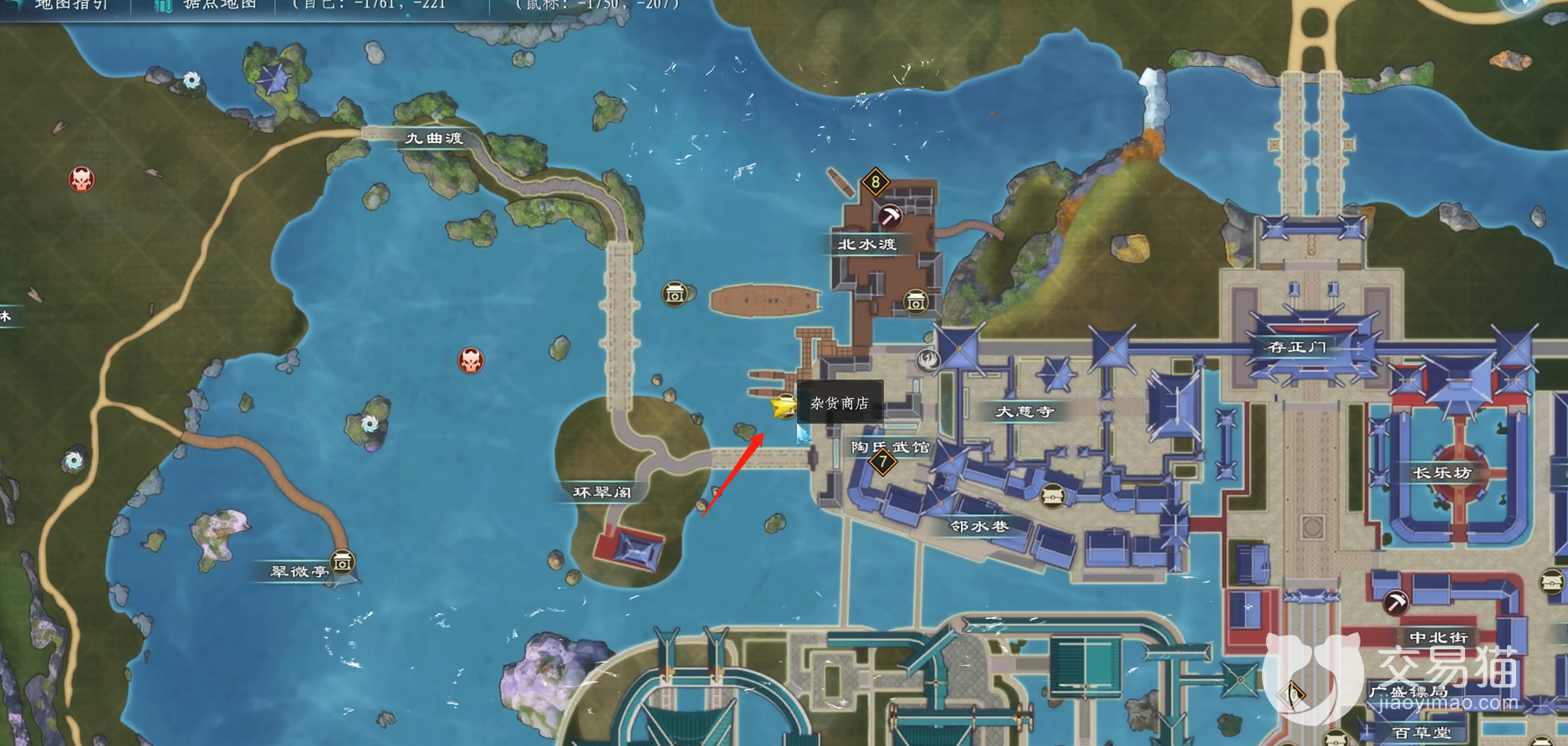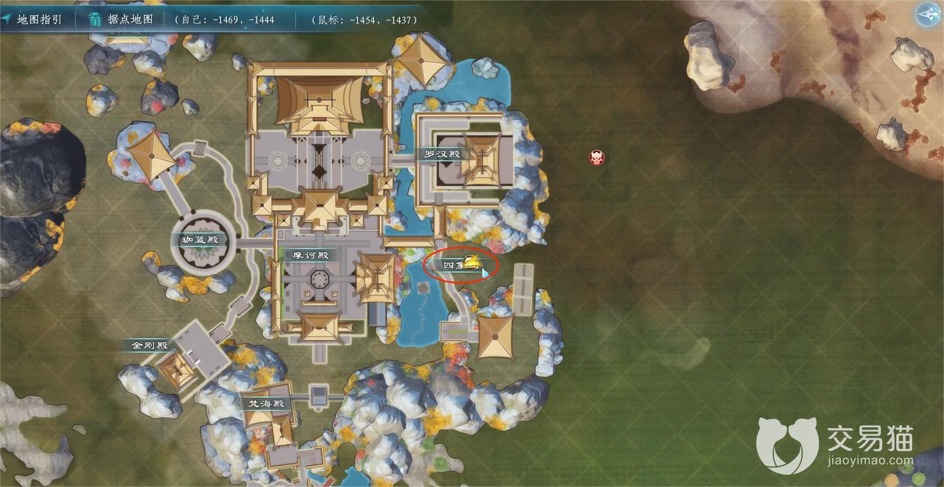 游戏中的黑市商人数量一共有十二位,他们每个人的分布位置都不同,最常用的两个商人像澜拜和澜薄分别分布在如上下图所示的“锦官北水渡”和“九华山四象园”两个位置。