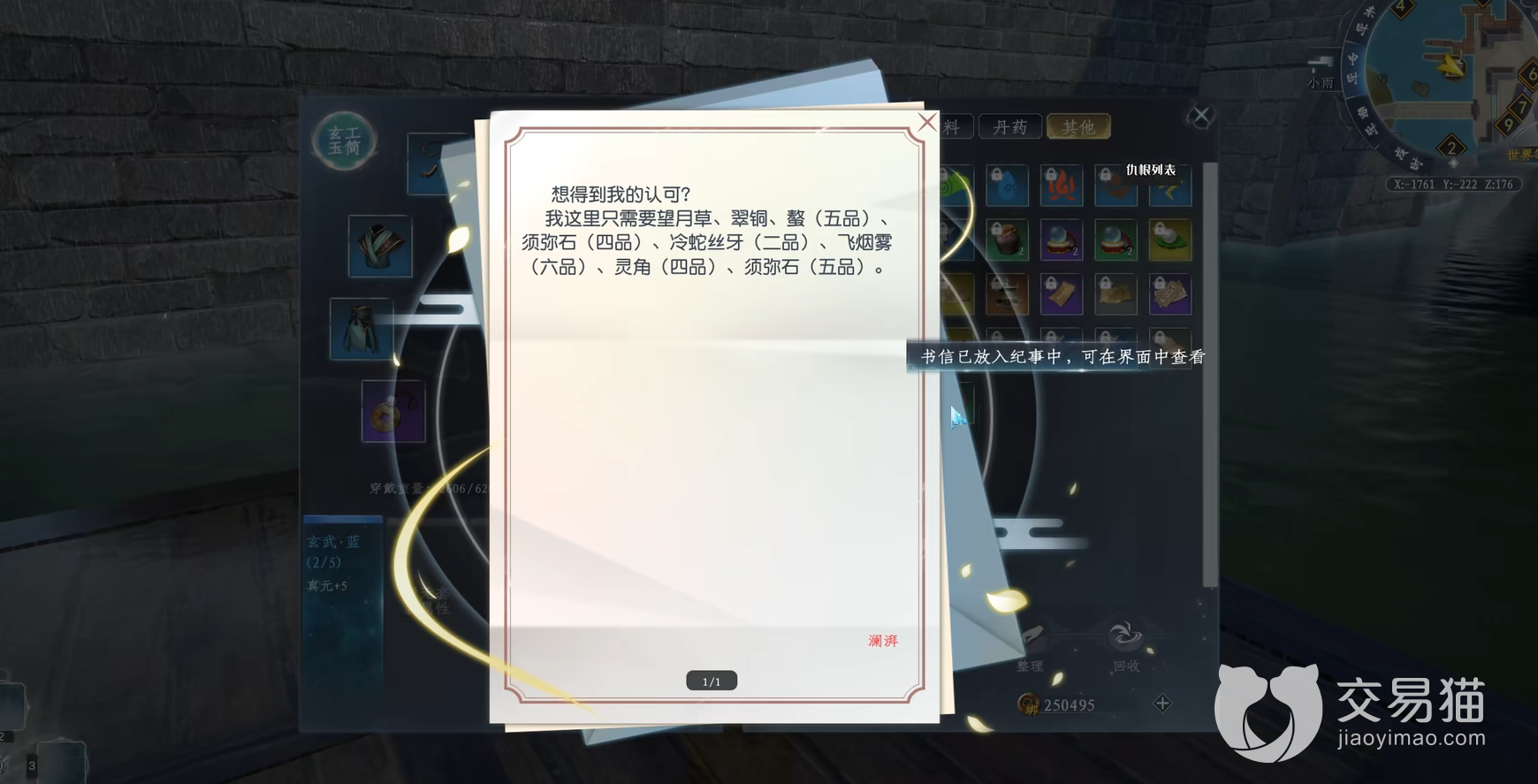 此外,除了这些升级练功的材料,玩家还可从中找到一些前缀带有“收集”和“清剿”两字的特殊物品,购买这些物品后,打开会发现是一封书信。