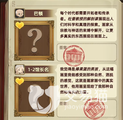 当玩家将所有的观众都挑战完毕之后就可以直接与馆长进行对话了,馆长对玩家说的第一句话就包含着重要的信息,他喜欢医学,所以玩家们在接下来的挑战汇总尽量使用与医学相关的画作可以让对方更容易满意,在这一轮比赛中,玩家们尽量出双数图,避免出单数。