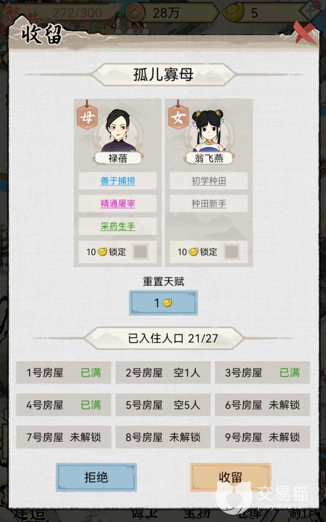 在游戏中,玩家们不需要像是抽卡游戏一样需要去招募居民,游戏中每隔一定的时间自动会有村民出现请求收留,这个时候玩家可以选择收留也可以选择赶走,在进行选择的时候,可以仔细看看他们的天赋属性,如果天赋属性颜色是紫色、橙色、红色就可以直接留下,除了颜色还可以看天赋属性条内容,如果出现了重复工种词条也是可以留下的,词条属性是可以在游戏内泡温泉进行提升的。