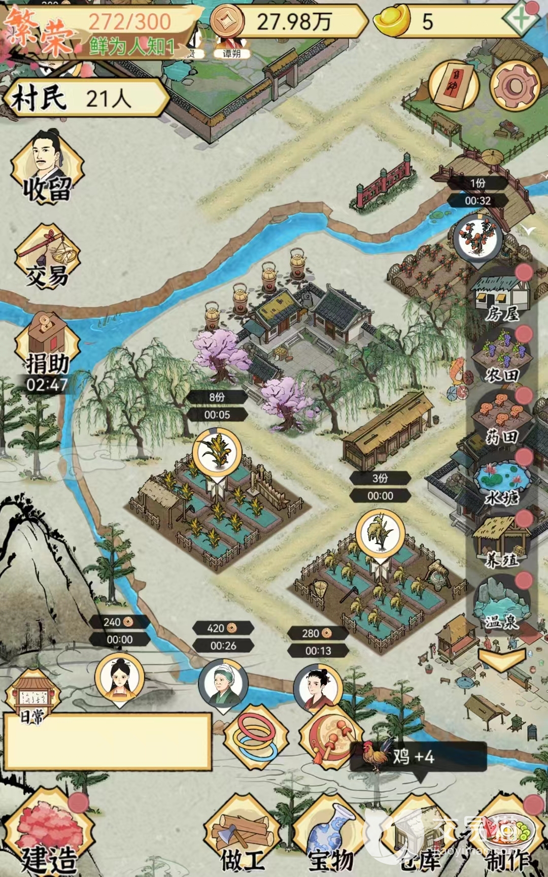 在游戏中玩家会随着游戏的繁荣度提升开荒出更多的土地和水域,这个时候各位玩家们就可以根据自己当前的实际情况来安排居民来进行种田养殖,种植的食物药材和养殖的水产家禽都是可以在【制造】界面做成菜肴,然后在【交易】界面进行出售的,在做菜选择的时候玩家们一定要注意了,不同的菜它们的价格也是不一样的,尽量选择制造当前能选择中最高价的菜。