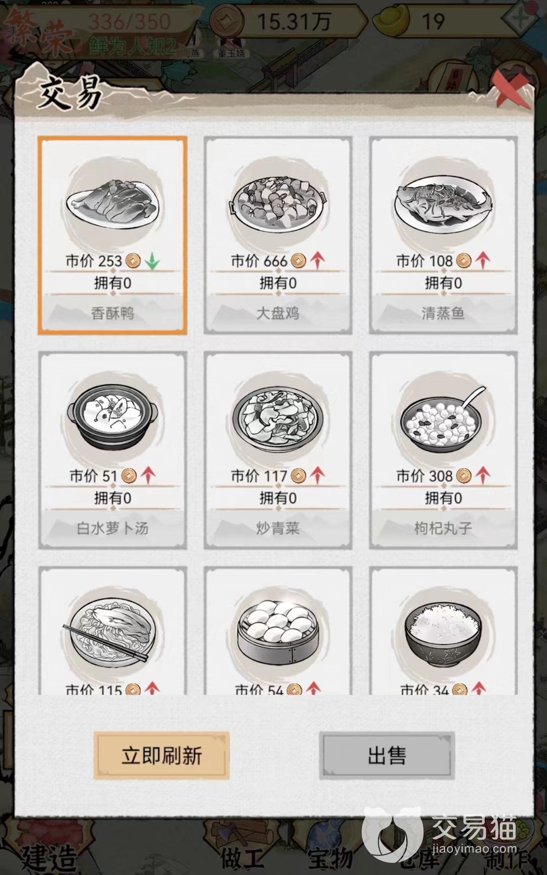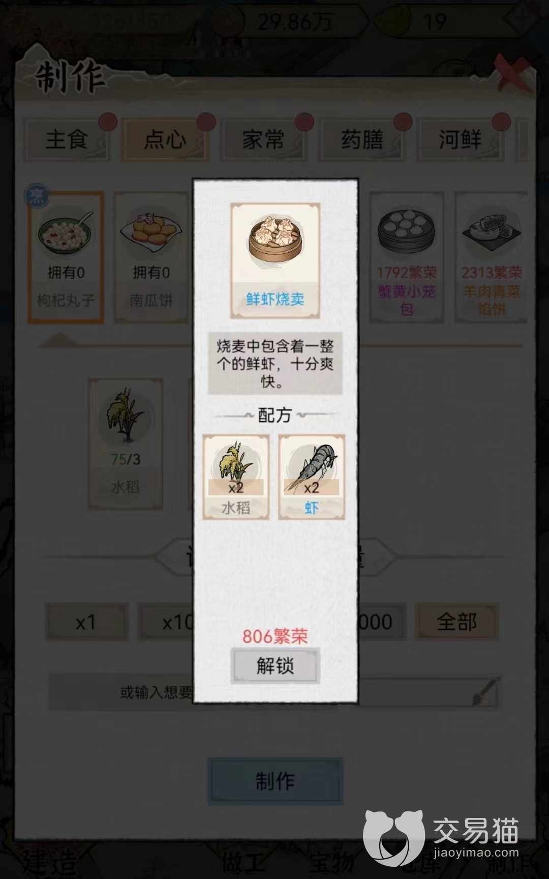 鲜虾烧卖:该食物在交易系统最低售价是367个铜币一份,最高价格是1088个铜币,平时价格在728个铜币左右。