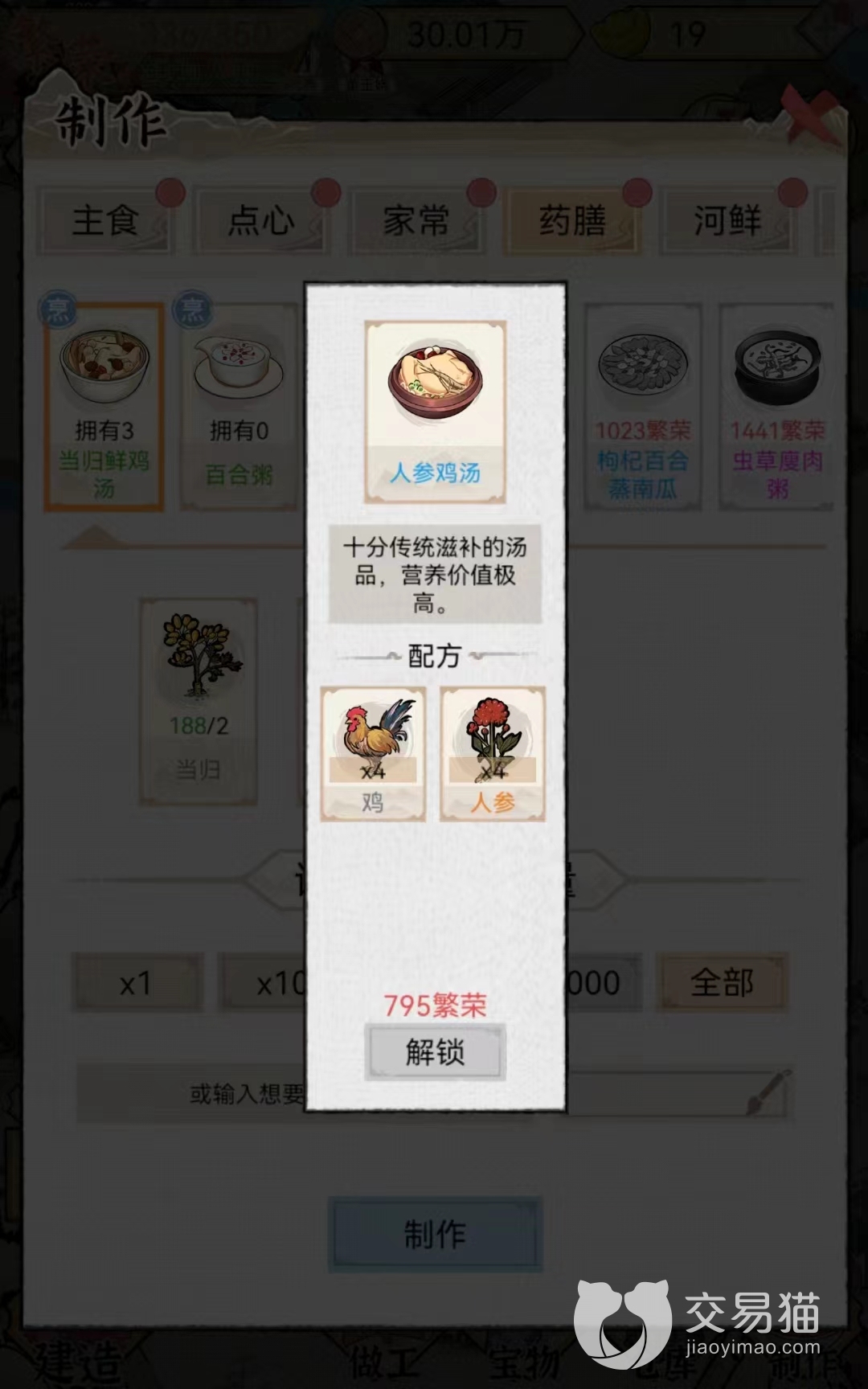 人参鸡汤:该食物在交易系统最低售价是829个铜币一份,最高价格是1917个铜币,平时价格在1317个铜币左右。