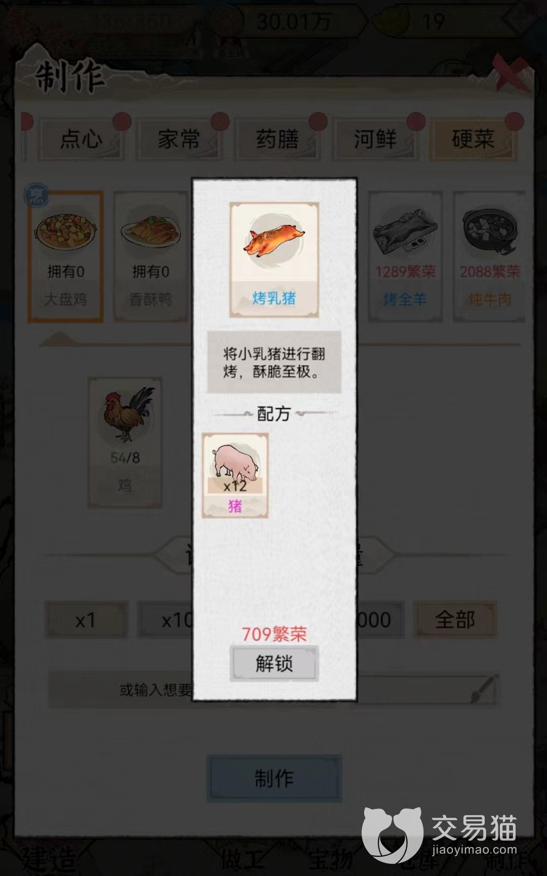 烤乳猪:该食物在交易系统最低售价是2686个铜币一份,最高价格是4134个铜币,平时价格在3410个铜币左右。