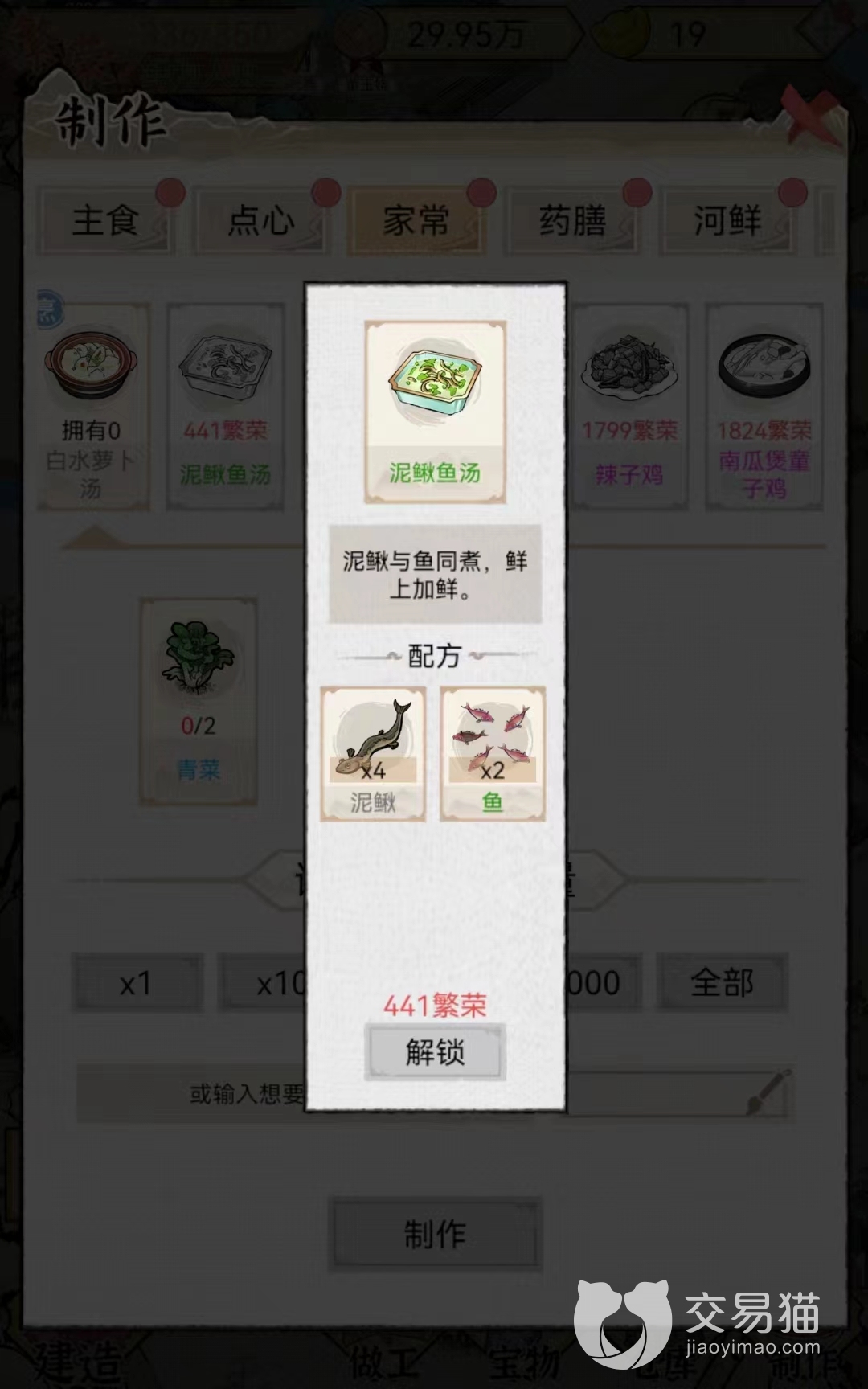 泥鳅鱼汤:该食物在交易系统最低售价是359个铜币一份,最高价格是1053个铜币,平时价格在706个铜币左右。