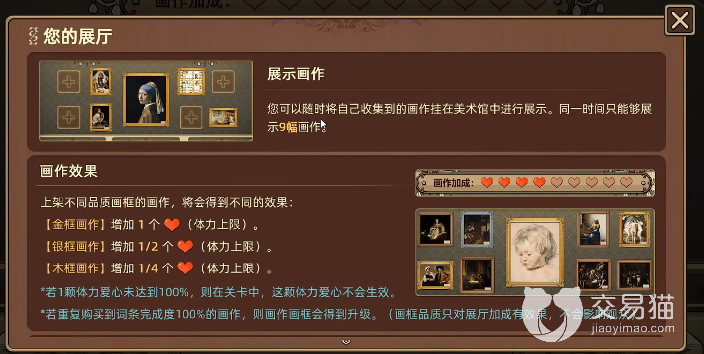 玩家小伙伴们在进入游戏之后可以进入画馆展览厅界面,该界面玩家一共可以布置9幅画来为主角增加生命值属性。画作的画框颜色代表了该作品在游戏内的道具品质等级,从高到底分别是:金色画框、银色画框、木质画框,这三种品质,不同的颜色对应着添加的生命体力值也是不一样的,金色可以给玩家添加1点生命值,银色画框则在金色画框之上减半,木质画框则在银色画框加成上减半。所以玩家在进行搭配的时候一定要注意颜色,可以反复多尝试一下,尽量将该功能带来的收益拉到最大。