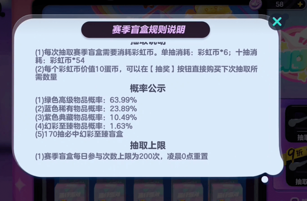 这游戏的抽卡是有保底机制的,最差在170抽的时候一定会出至臻盲盒,大部分玩家肯定是达不到这个上限的,多数都是在100抽左右获得该赛季的高级皮肤,按照彩虹币来看需要700个到800左右,数量还是很大的,建议零氪和微氪玩家存储一段时间的彩虹币,看到自己特别喜欢的皮肤再下池,这样就能一定能中奖。