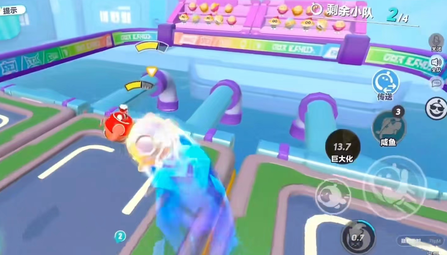 当场上玩家数量减少的时候,这时候就建议再用一次巨大化技能将一些边缘位置的敌人给冲到外面,当只剩下最后的几人时,就是收割的好时机了,直接巨大化防止被秒,然后捡起道具砸向敌人获得胜利。