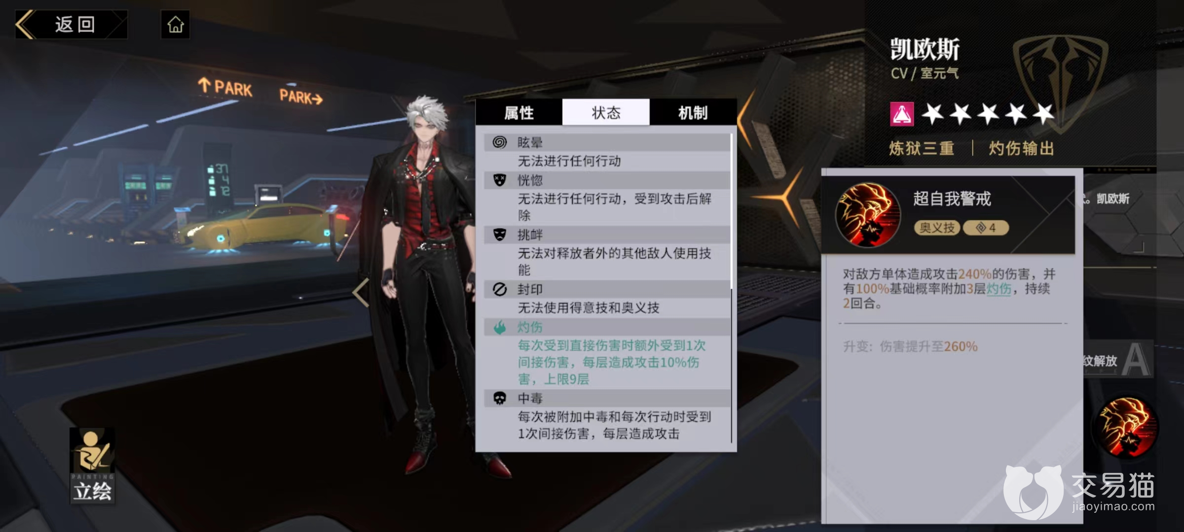 得意技能人格分离,伤害对方单体之后再随机攻击敌方目标,奥义技自我警戒,选择对方单体造成一次高额伤害攻击,并且必定会附加三层灼烧效果。被灼烧影响的敌人每受到一次直接伤害时,就会额外受到一次间接伤害,可以叠加到9层,有了这一效果凯欧斯的得意技就非常强势,因为得意技效果是随机攻击敌方三次,每一次都可以触发对方身上的然灼烧效果,这就使得伤害进一步提高。