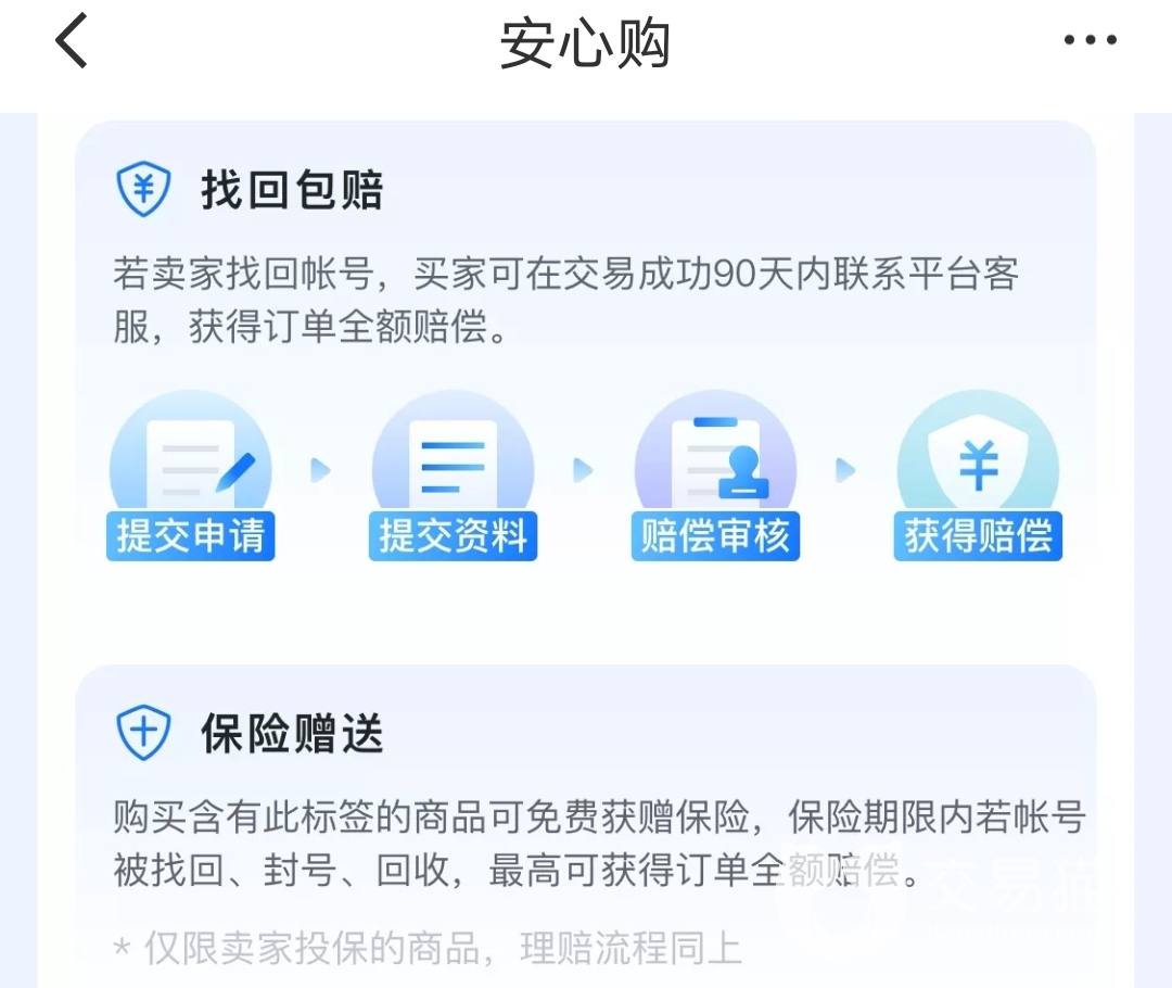 所以小编比较推荐各位选择带有安购标识的商品,这是由于加入安心购的商品,有找回包赔服务,还会有保险附赠,如果保险期限内账号有被找回、封号、回收等状况,可获得不同金额的赔付。