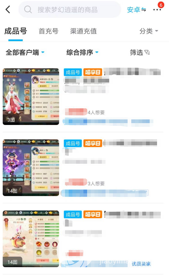 2、在开放的梦幻逍遥交易频道中,各位可以轻松了解到目前一个成品游戏号的具体价格。不同商品之间的价格差异,也会帮助玩家们了解到现在的交易行情,从而可以更直观的针对某一个商品进行议价。当然,在专区内大家也可以使用筛选来获得自己更满意的商品内容。