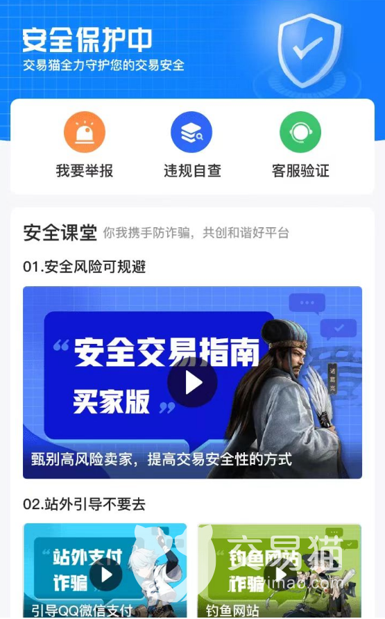 2、随时都开启的安全保护中心内,玩家们还可以通过各种视频教学了解到最基础的安全知识,平台也开放了用户单独的举报入口,各种有问题的信息都可以在这里进行处理,玩家们也会在短时间内得到回应,让大家共同参与安全维护是交易猫的一个核心优势。