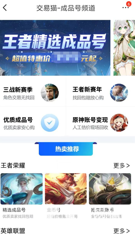 2、大家在交易猫的平台当中,可以直接进入成品号交易中心,找到针对王者荣耀的交易专区。其中各种类型的游戏账号会直接呈现,玩家们在选择的时候,可以根据账号的价格来进行判断是否值得入手,而详情页面当中的内容,也将更具体的展现出游戏账号的价值。