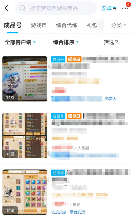 2、各位可以利用搜索功能快速获取到梦幻西游的交易大区,这里各种精品游戏号将得到展现,可以从价格和卖家的信用度来进行参考,每一个商品也将带来相关截图,这些信息都将帮助更快速的进行了解,从而找到自己喜欢的游戏号并下单。