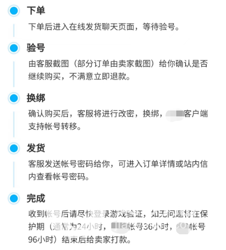 3、选择这个平台之前肯定也得了解一下交易的流程,在每一个账号首页里都能看到流程图,先下单锁号然后客服通过私聊形式给予账号密码,确认验号无误之后开始换绑,卖家和客服都会极力配合完成交易,最后安心购生效后享受包赔政策。