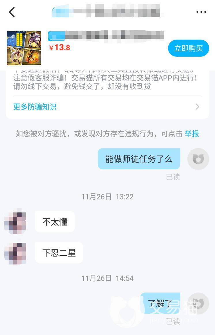 由于卖号的用户数量庞大,因此玩家们在咨询账号问题的过程中,会遇到一些实时在线用户,向对方提出有关账号的疑问后,对方会第一时间给予回复,这一点着实让玩家们舒心很多,毕竟买号这种事,很忌讳那种问到一半,然后没了下文的情况,很影响购号体验,在交易猫中有这么多用户在线回复,痛快交易。