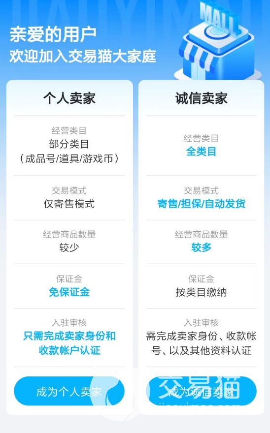 2、为了让各位的游戏账号能够更快的进行交易,首先大家就需要去得到一个商品发布的权限。在进入到交易猫之后,玩家们可以通过个人中心来申请成为一个平台内的卖家。解锁了卖家身份,各位才能够轻松的完成不同游戏商品的发布。